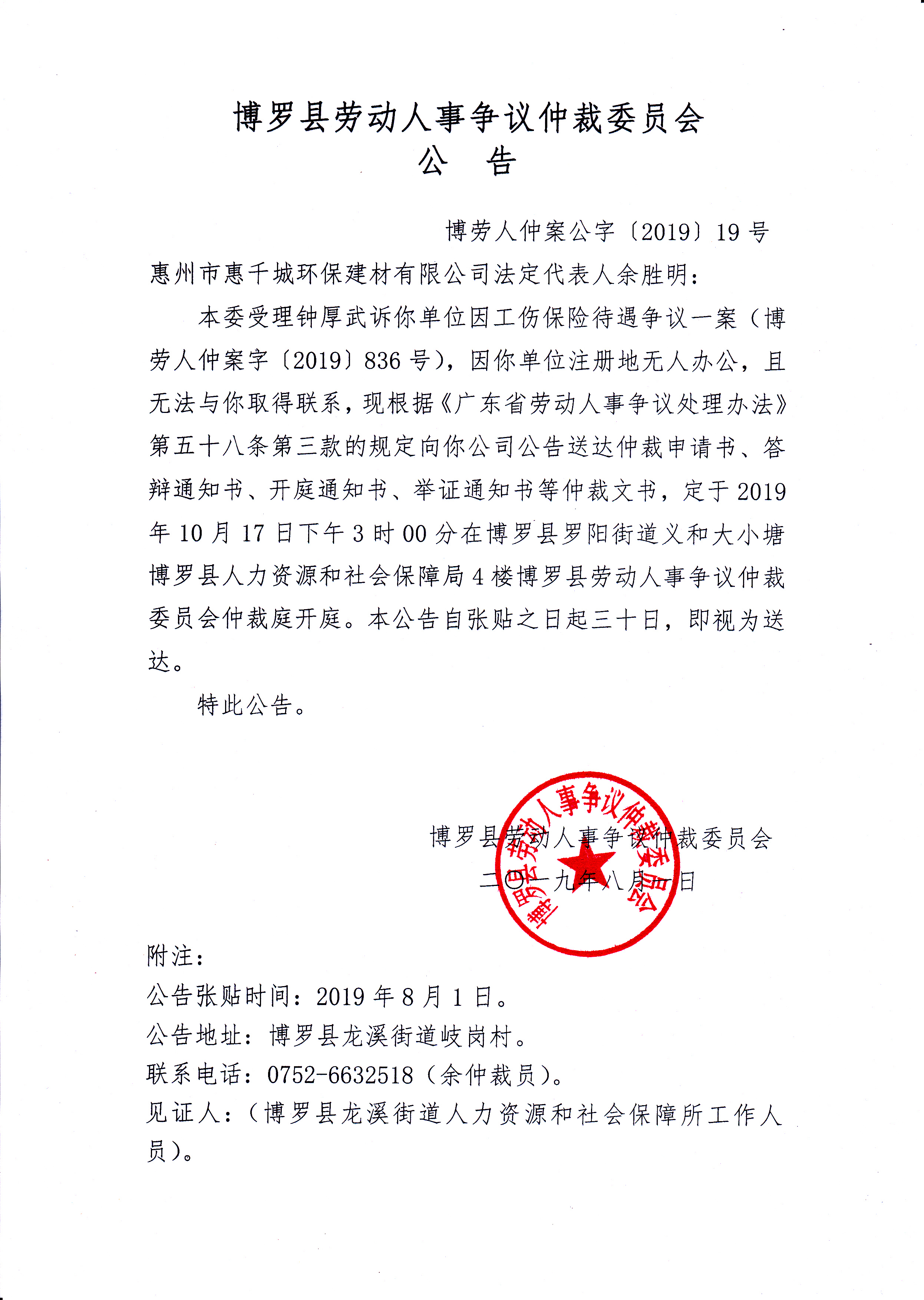 中文博彩平台劳动人事争议仲裁委员会公告(博劳人仲案公字[2019]19号)
