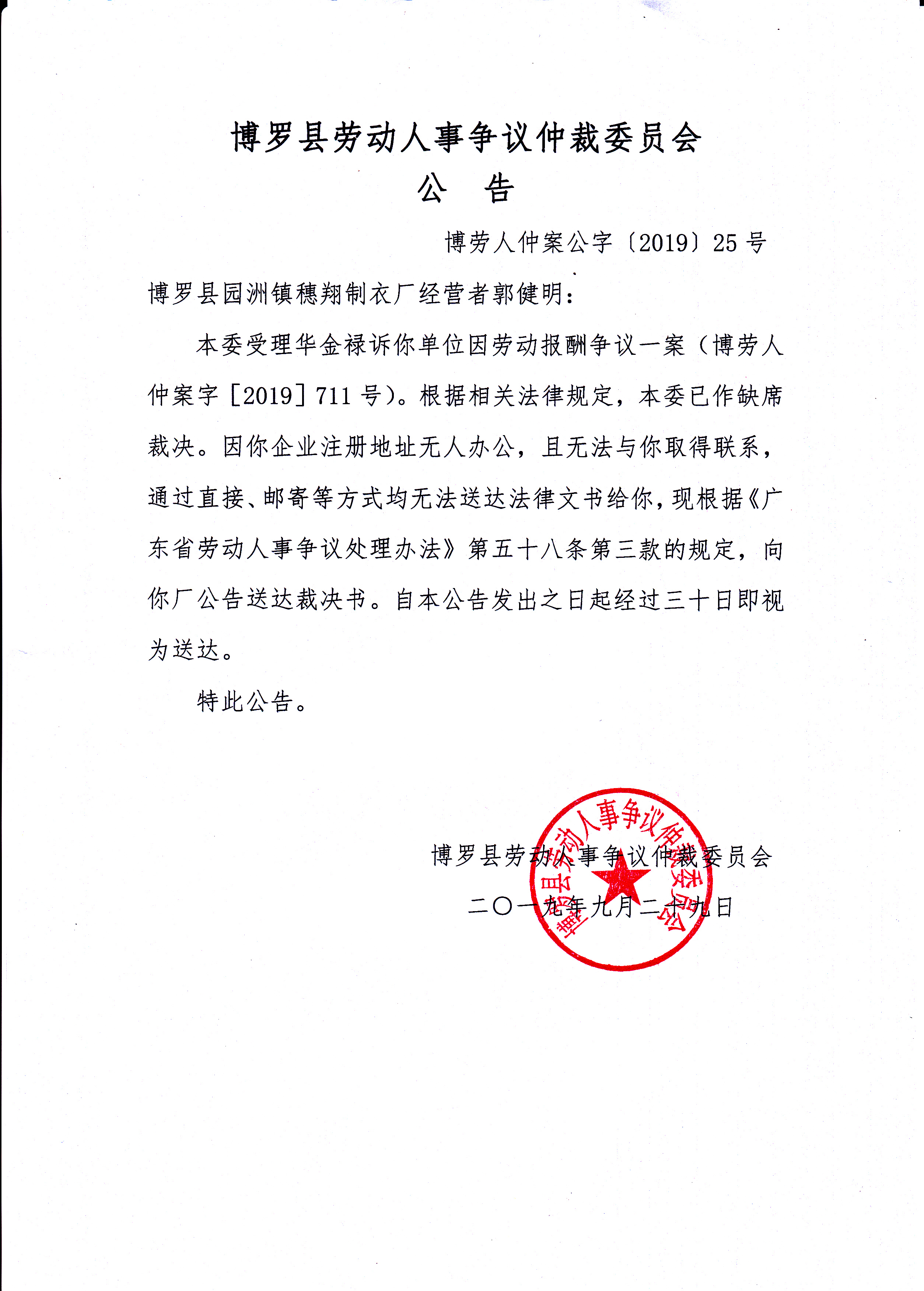 中文博彩平台劳动人事争议仲裁委员会公告(博劳人仲案公字[2019]25号)