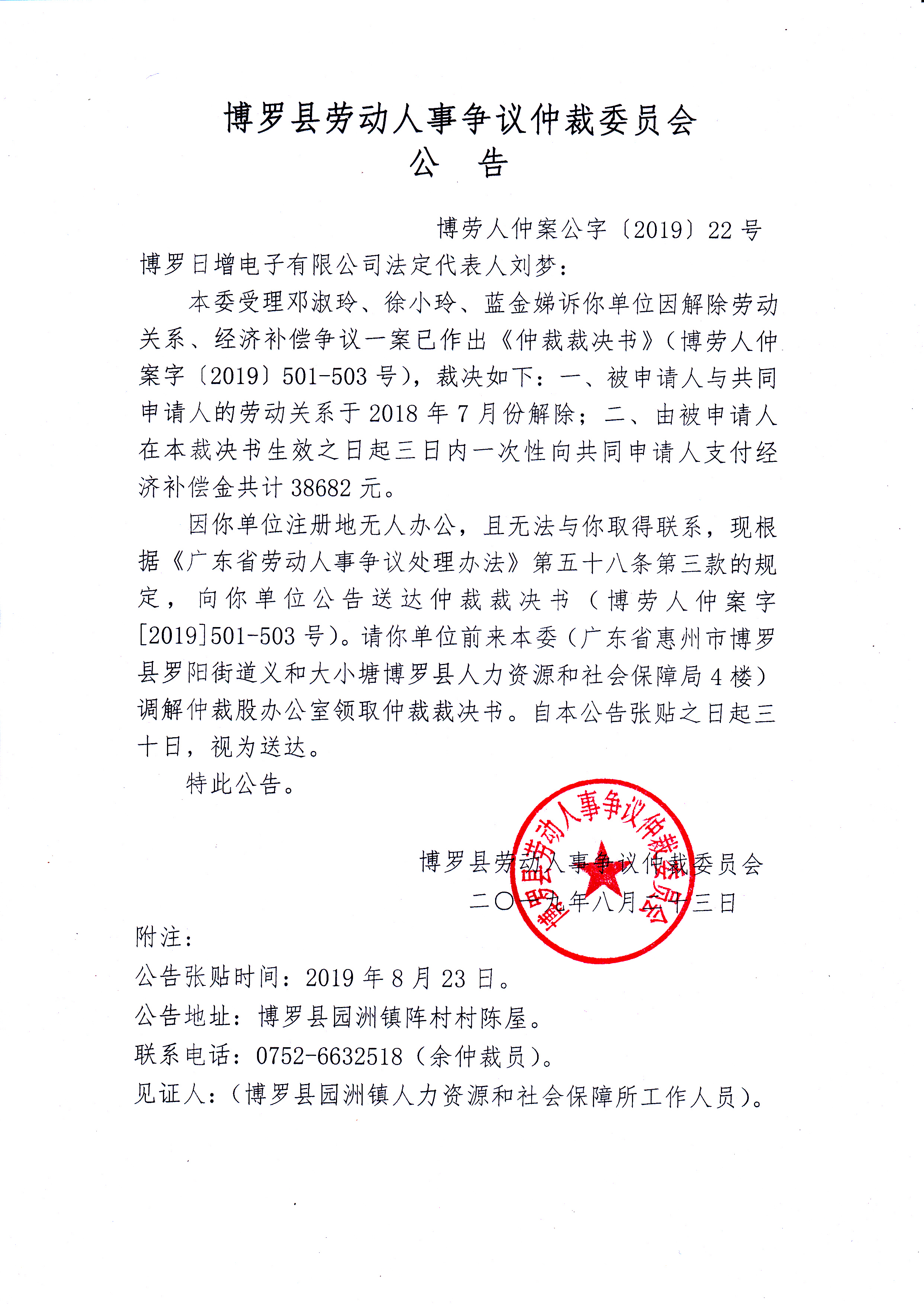 中文博彩平台劳动人事争议仲裁委员会公告(博劳人仲案公字[2019]22号)