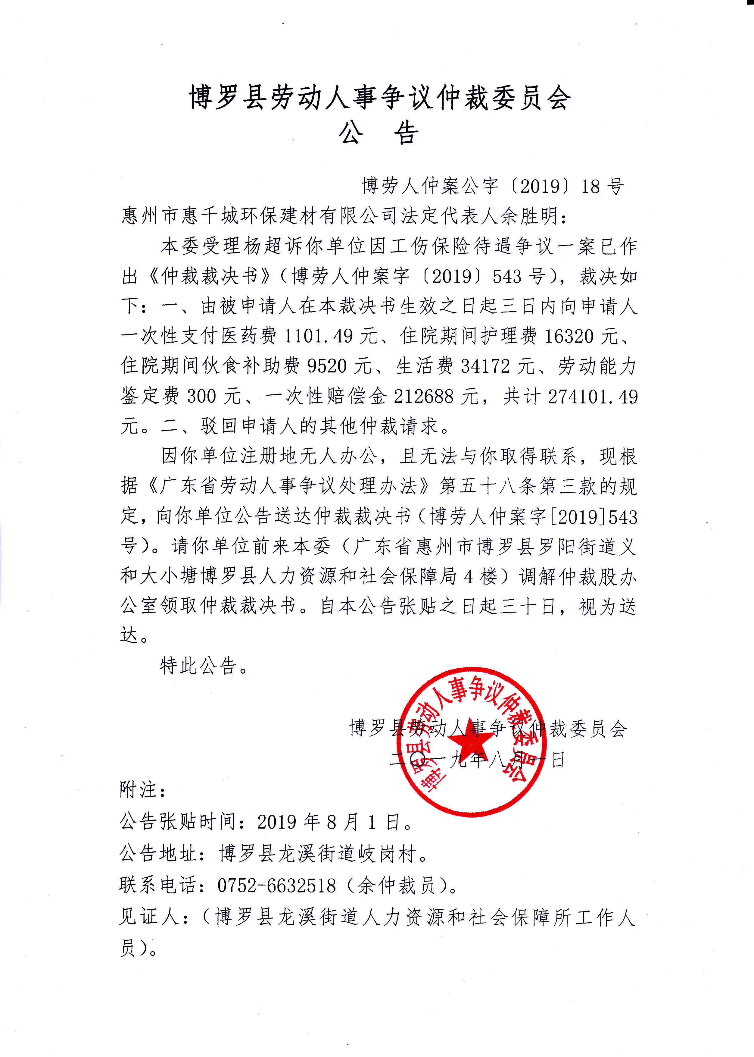 中文博彩平台劳动人事争议仲裁委员会公告(博劳人仲案公字[2019]18号)