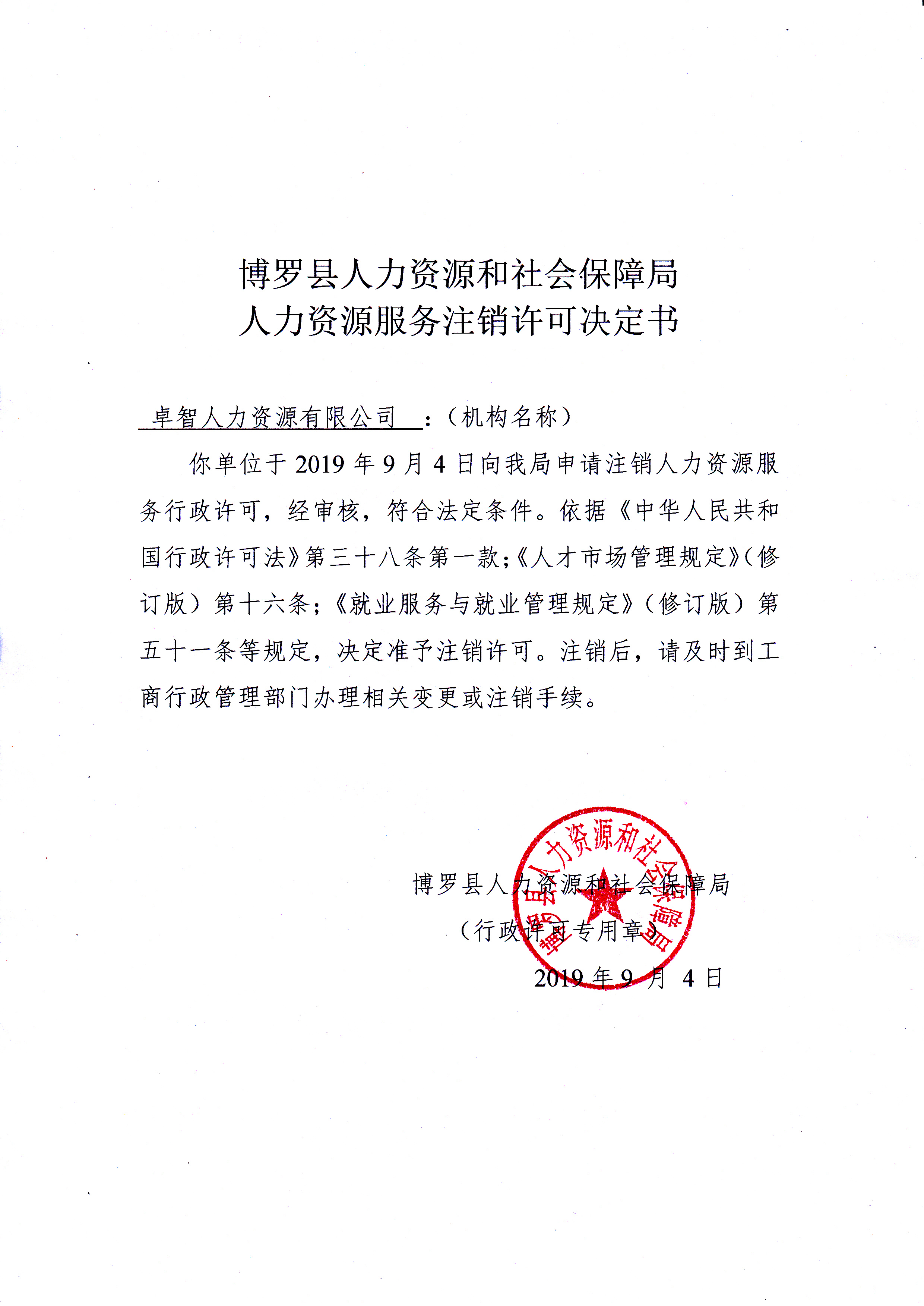 人力资源服务注销许可决定书(卓智人力资源有限公司)