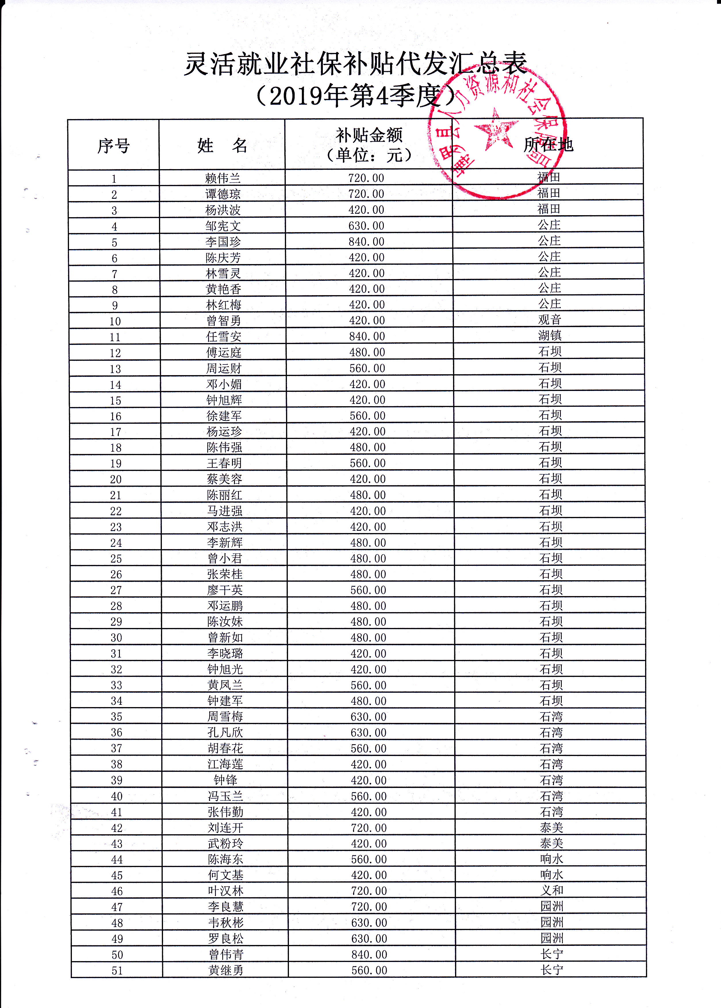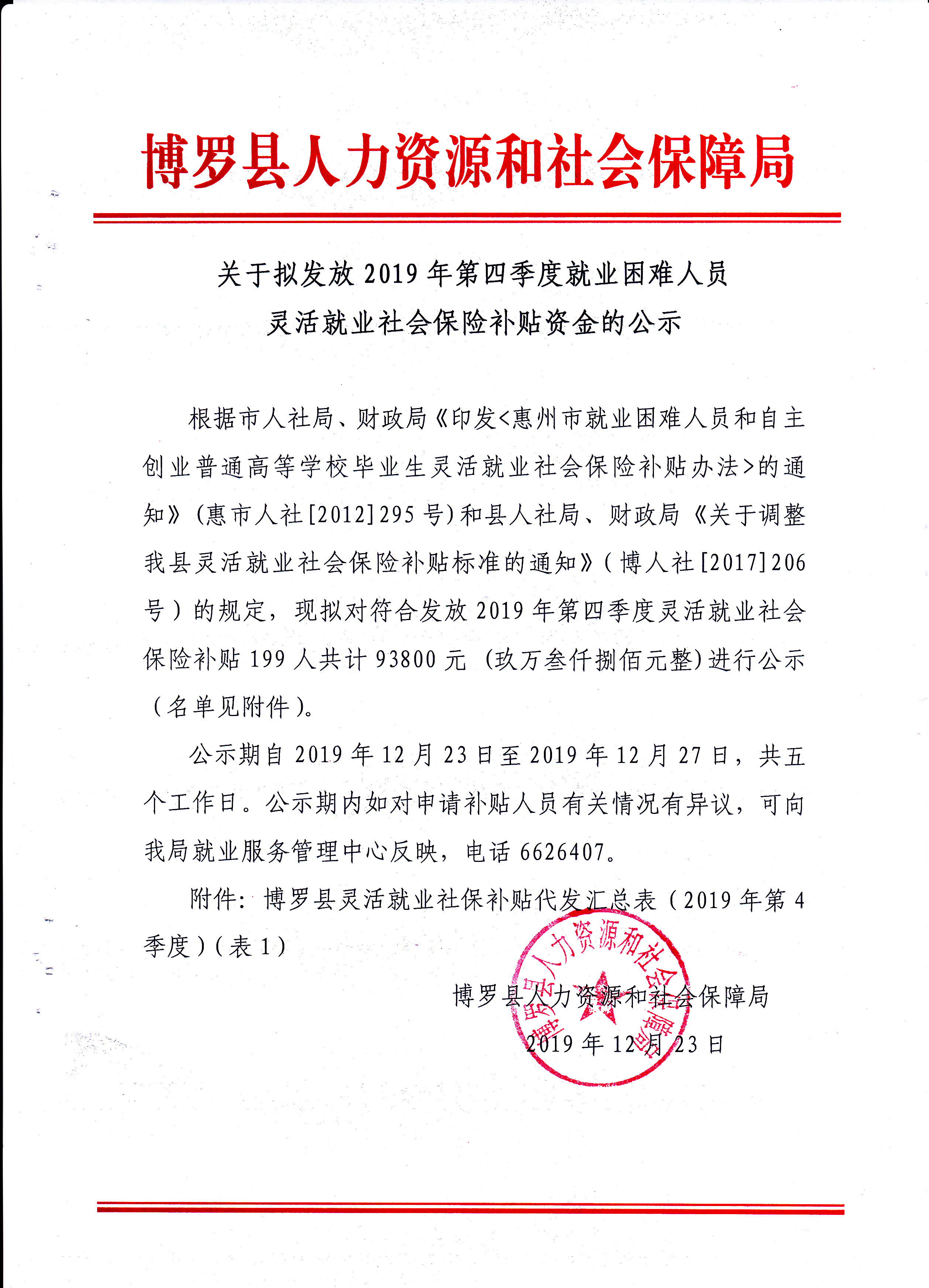 关于拟发放2019年第四季度就业困难人员灵活就业社会保险补贴资金的公示