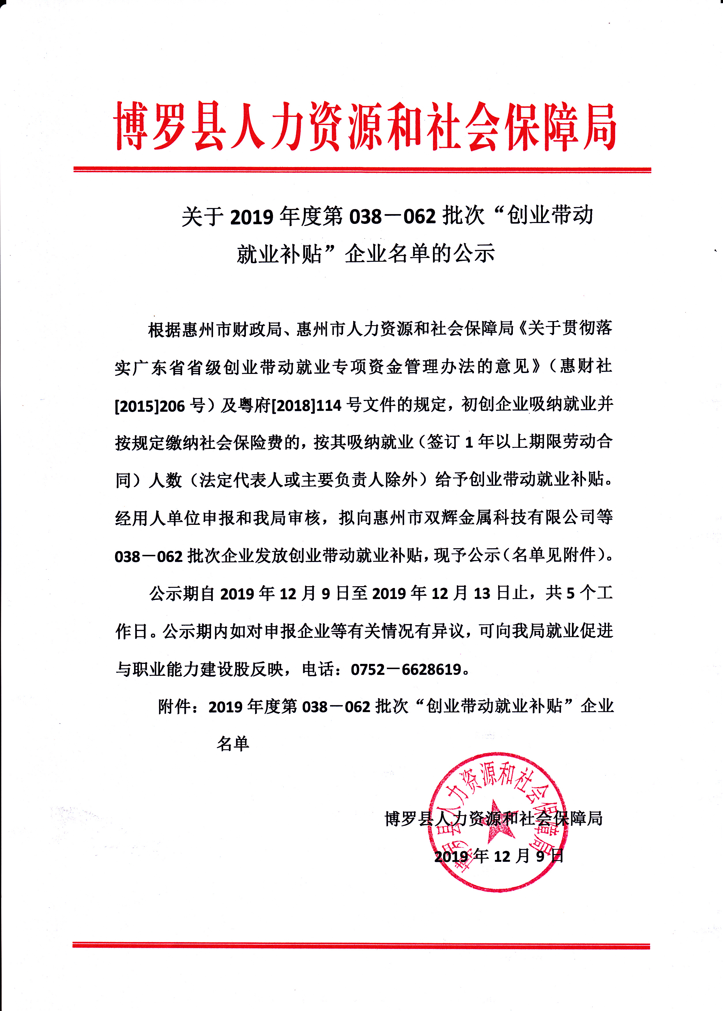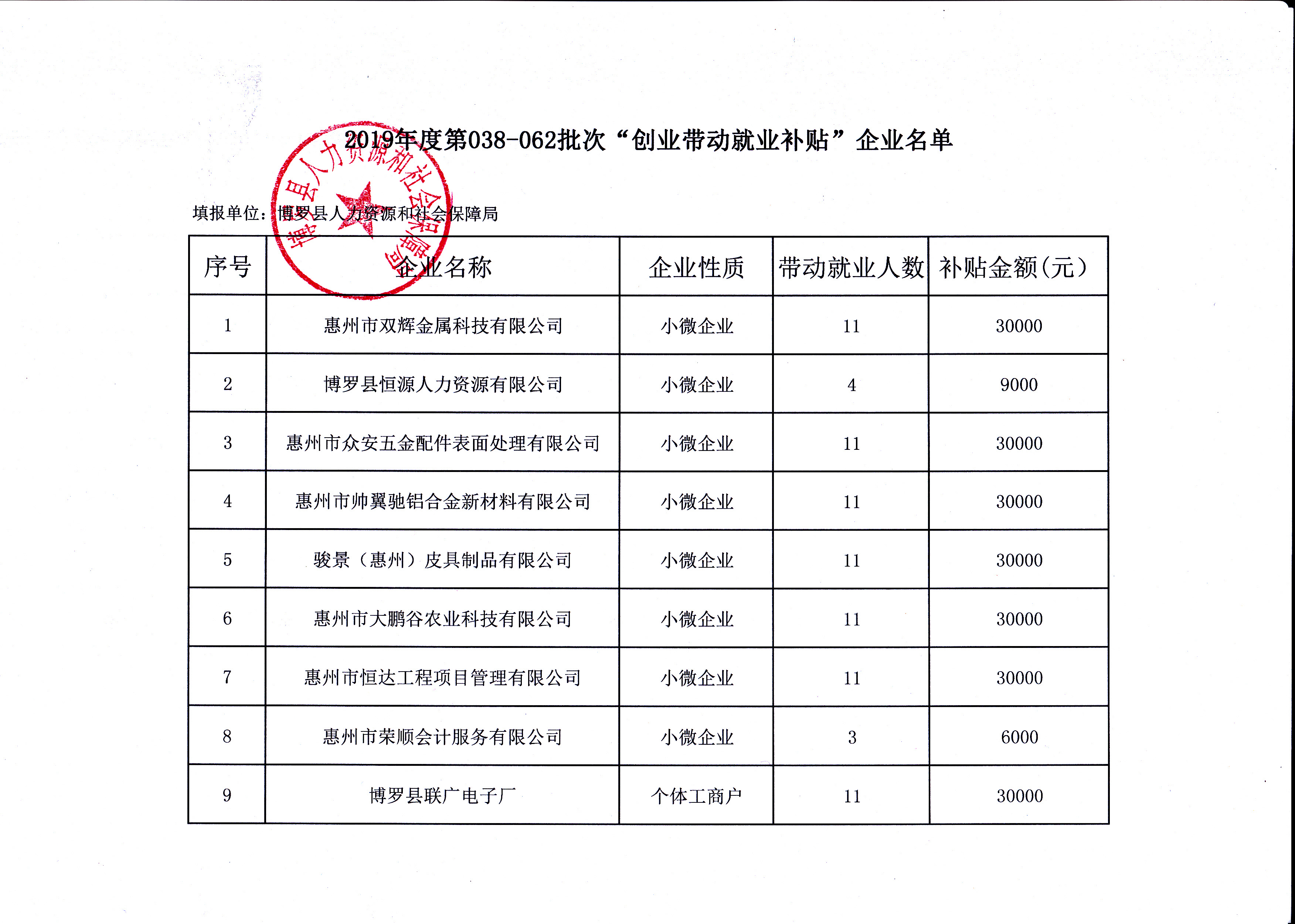 关于2019年度第038-062批次“创业带动就业补贴”企业名单的公示