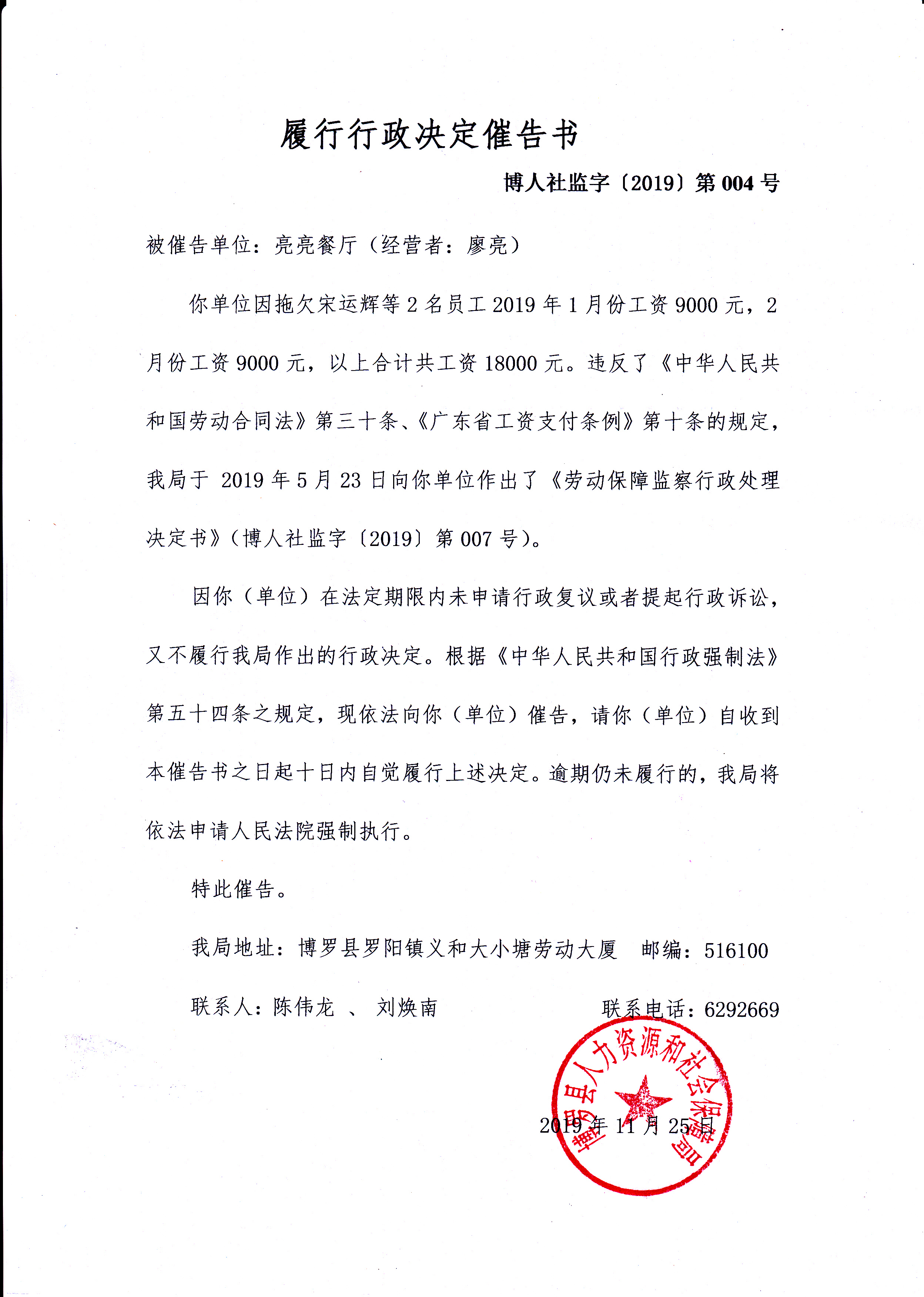 履行行政决定催告书(博人社监字[2019]第004号)