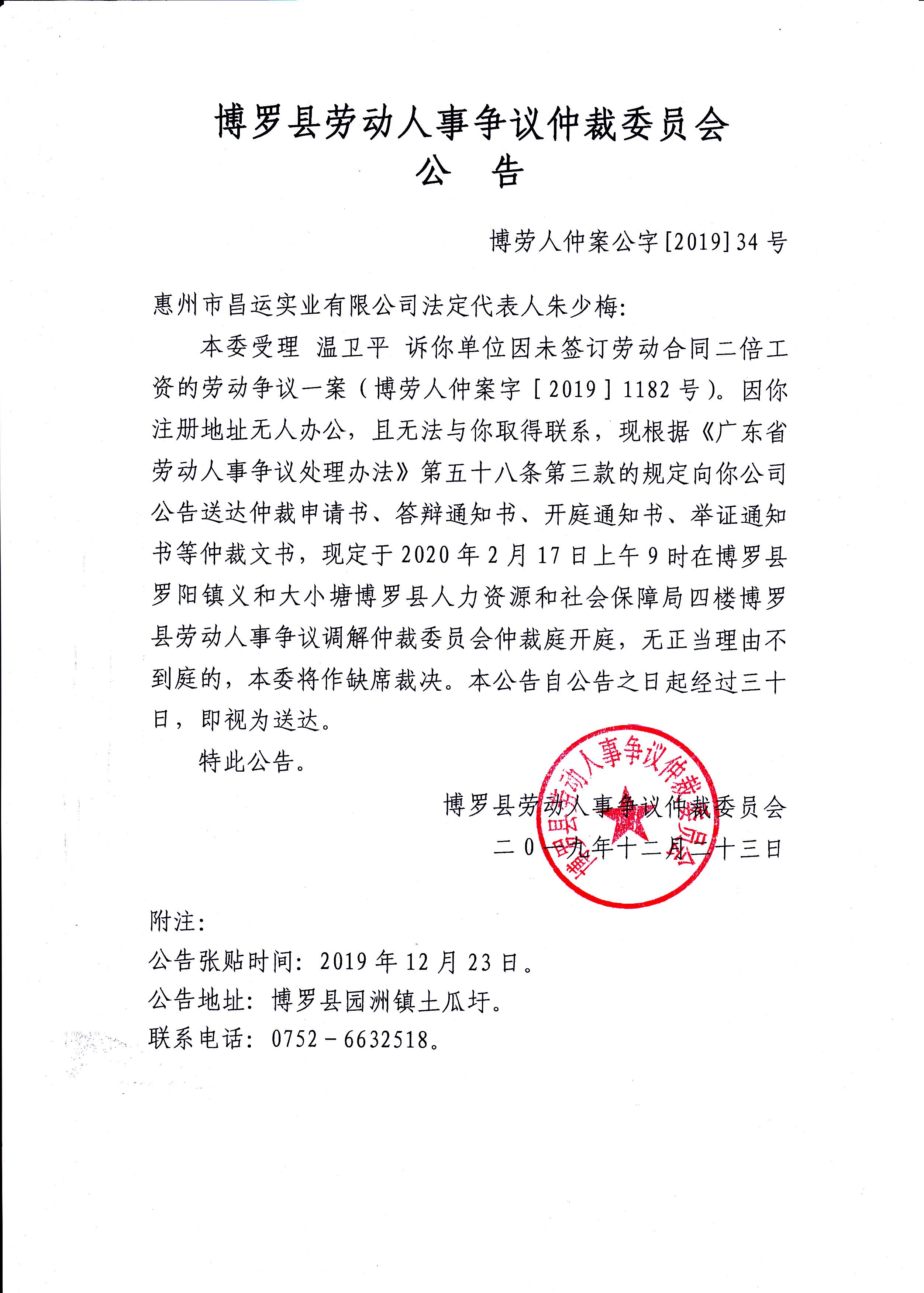 中文博彩平台劳动人事争议仲裁委员会公告(博劳人仲案公字[2019]34号)