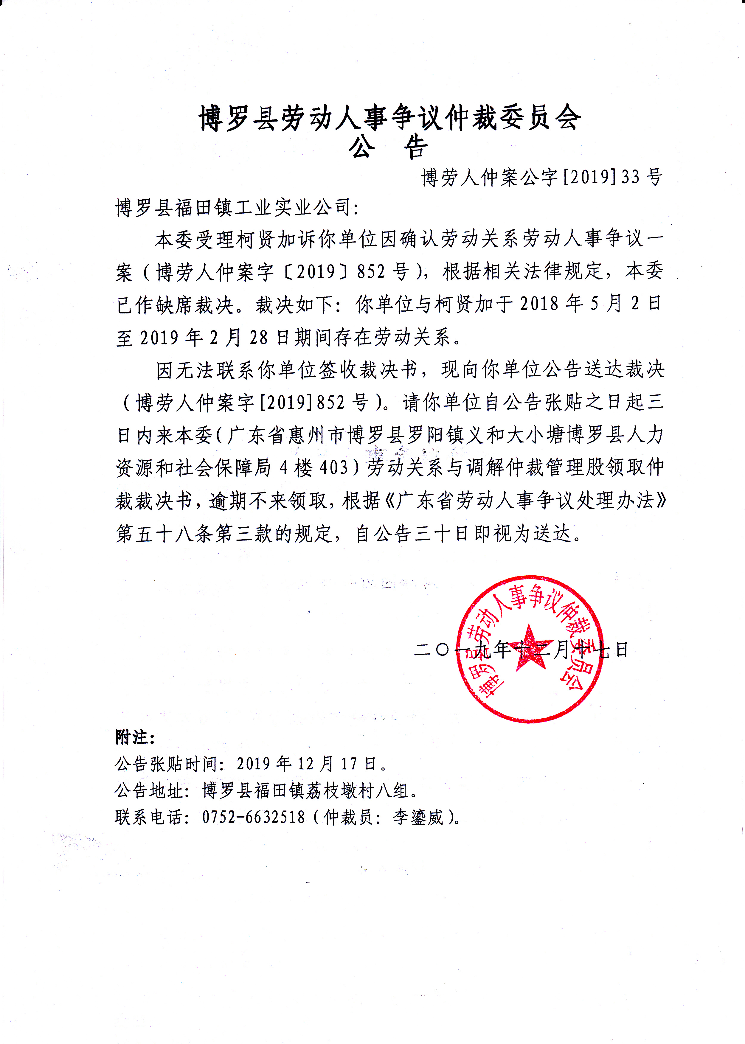 中文博彩平台劳动人事争议仲裁委员会公告(博劳人仲案公字[2019]33号)