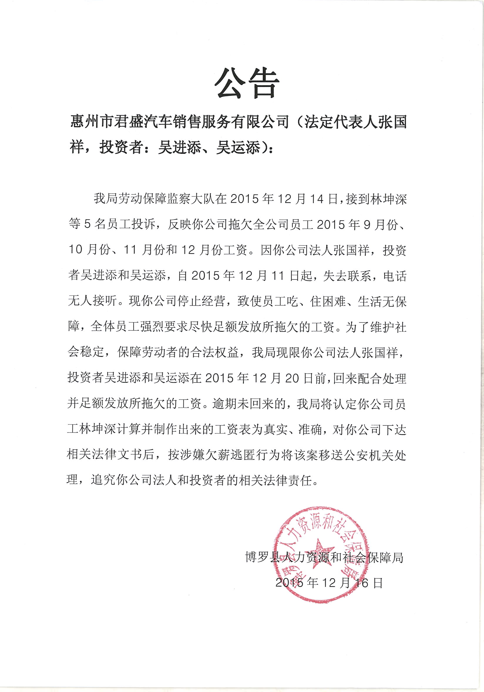 通知用人单位配合处理欠薪案件的公告(惠州市君盛汽车销售服务有限公司)