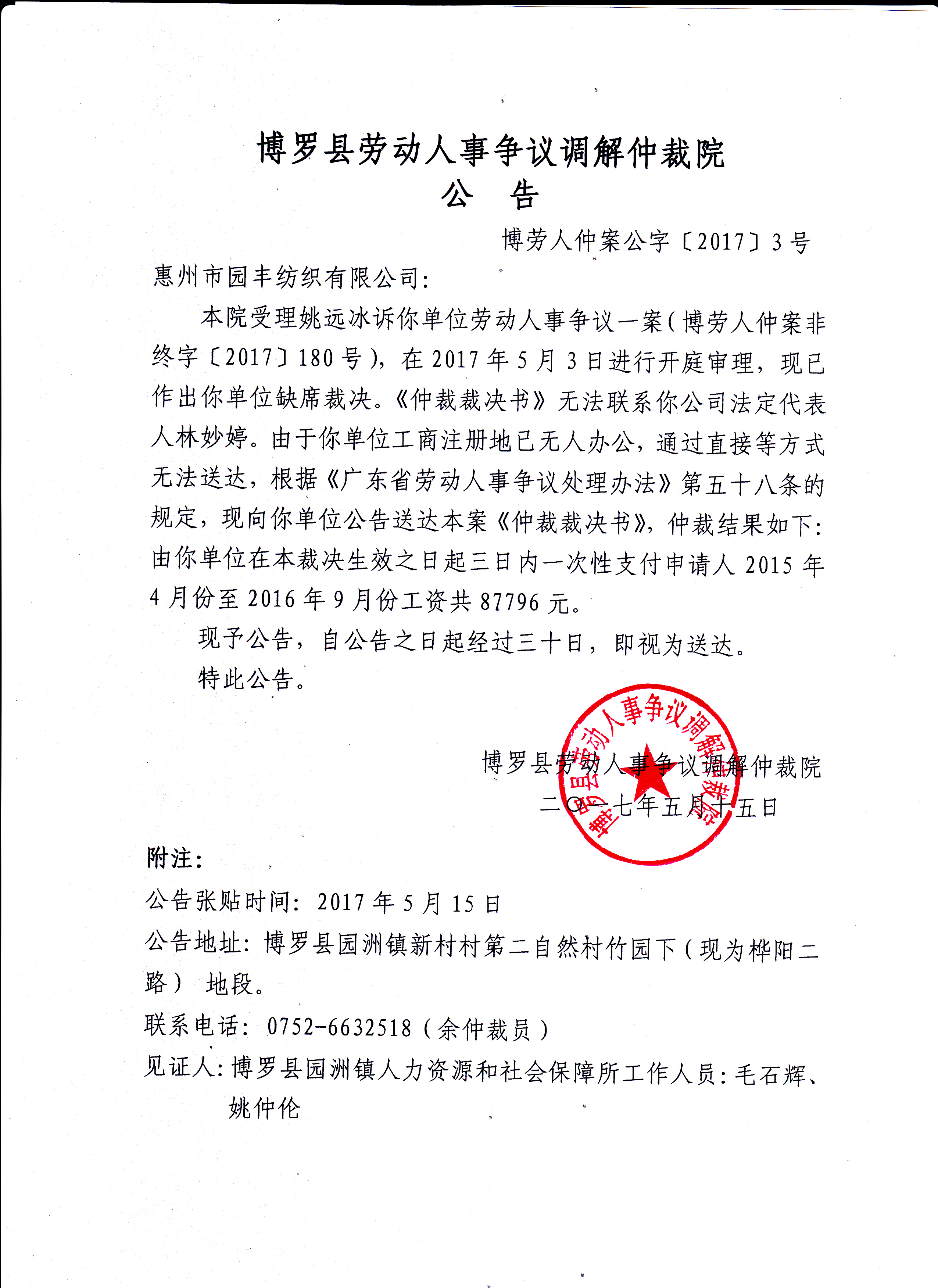 中文博彩平台劳动人事争议调解仲裁院公告(博劳人仲案公字[2017]3号)