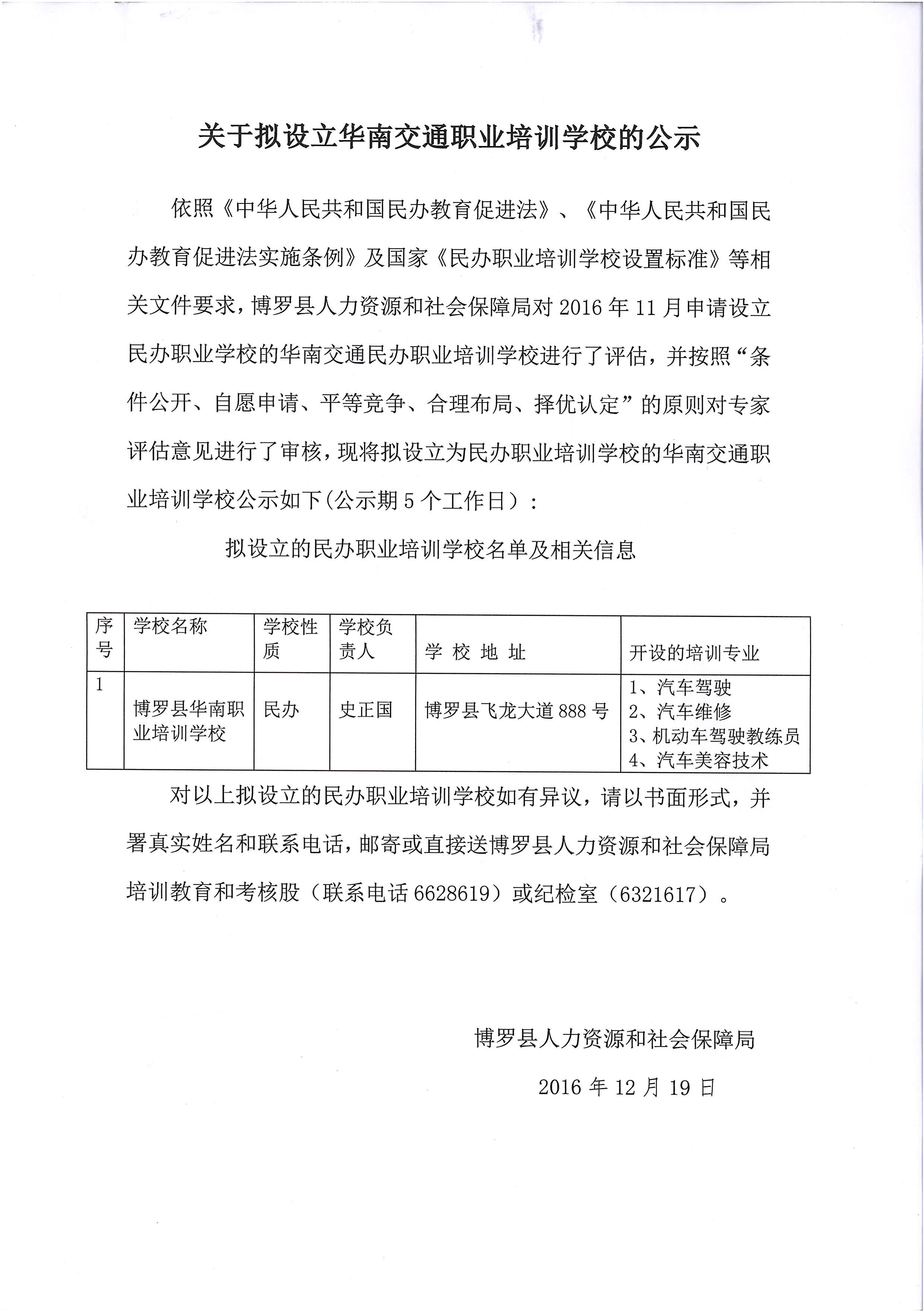 关于拟设立华南交通职业培训学校的公示