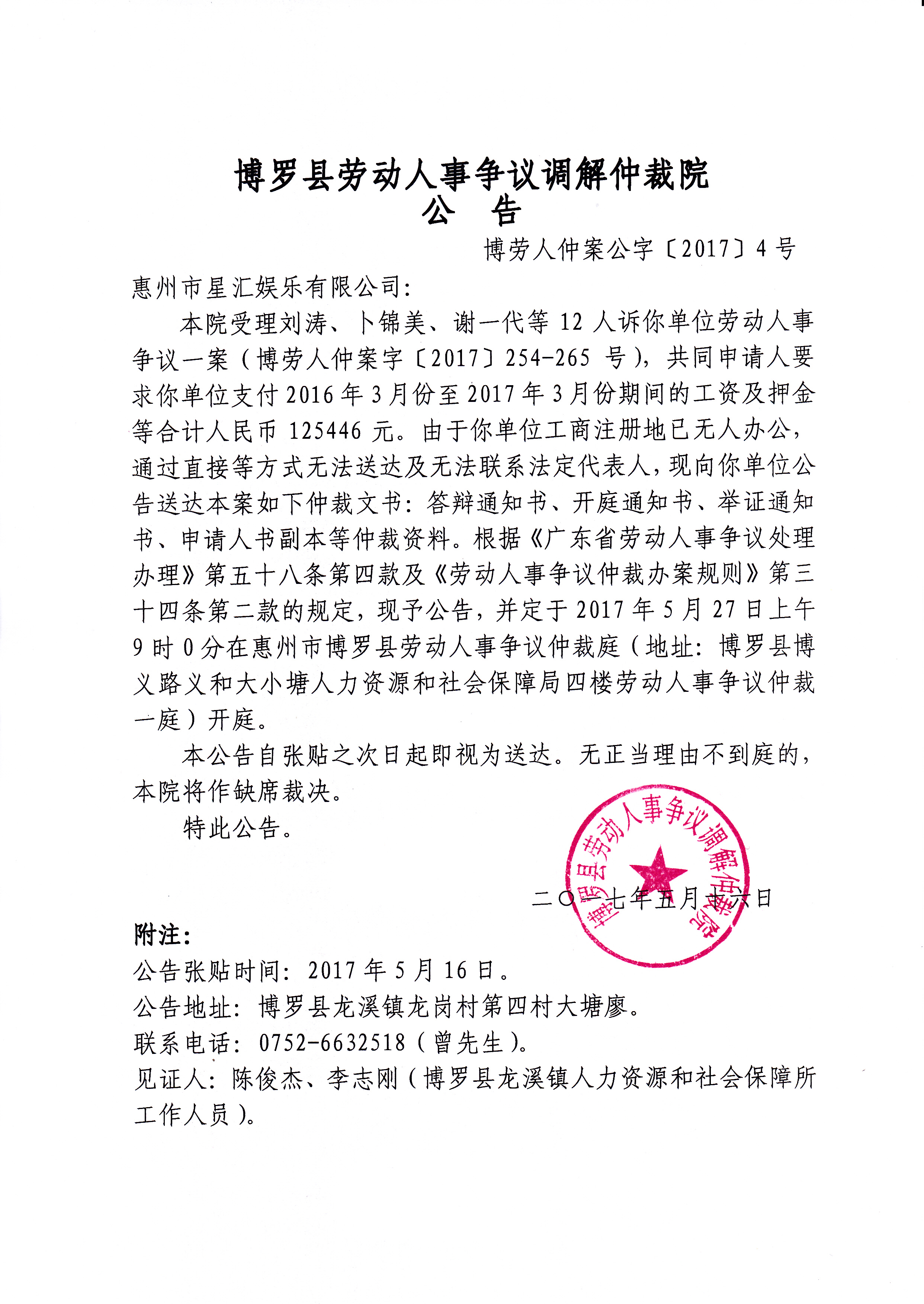 中文博彩平台劳动人事争议调解仲裁院公告(博劳人仲案公字[2017]4号)