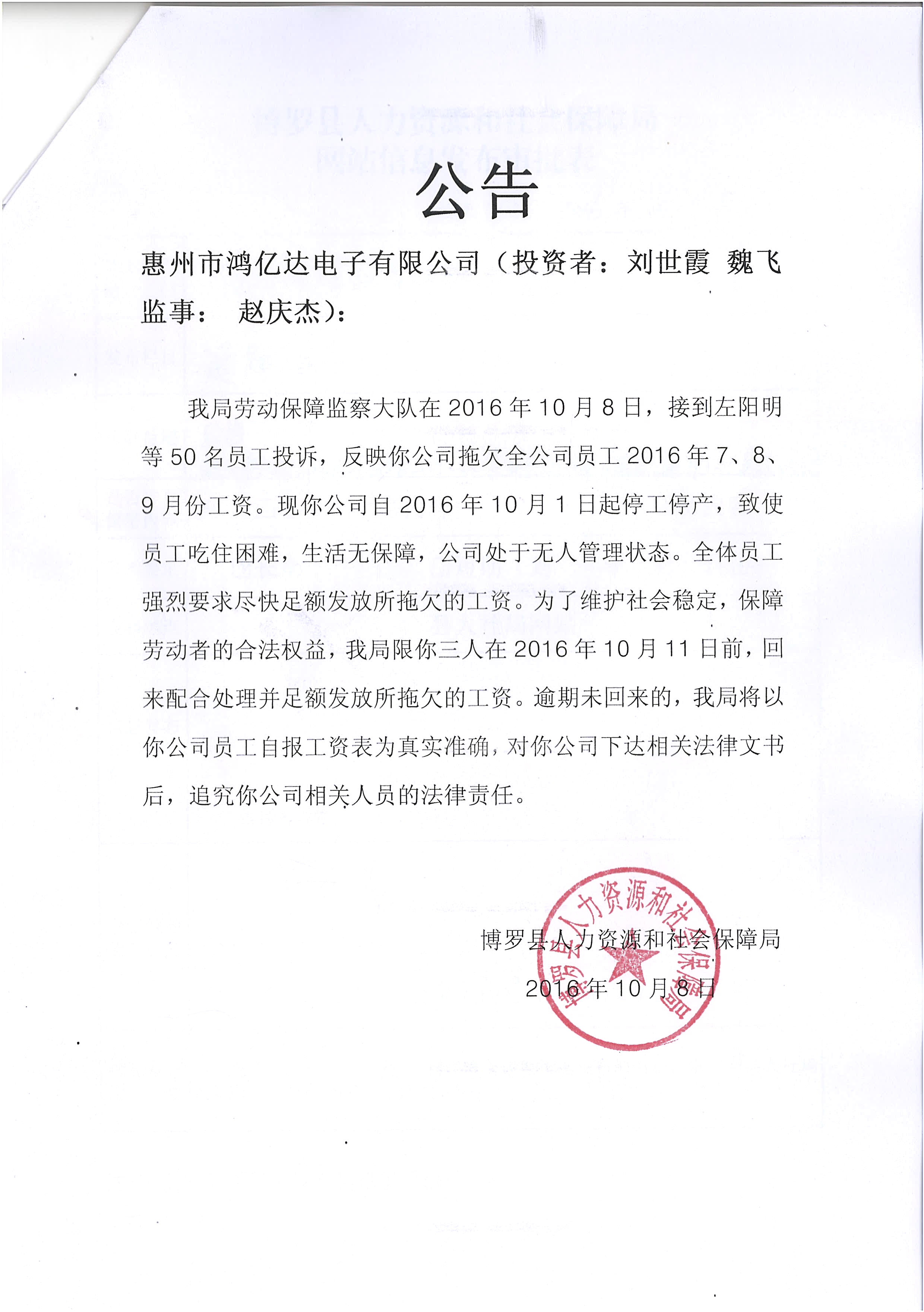 通知用人单位配合处理欠薪案件的公告(惠州市鸿亿达电子有限公司)