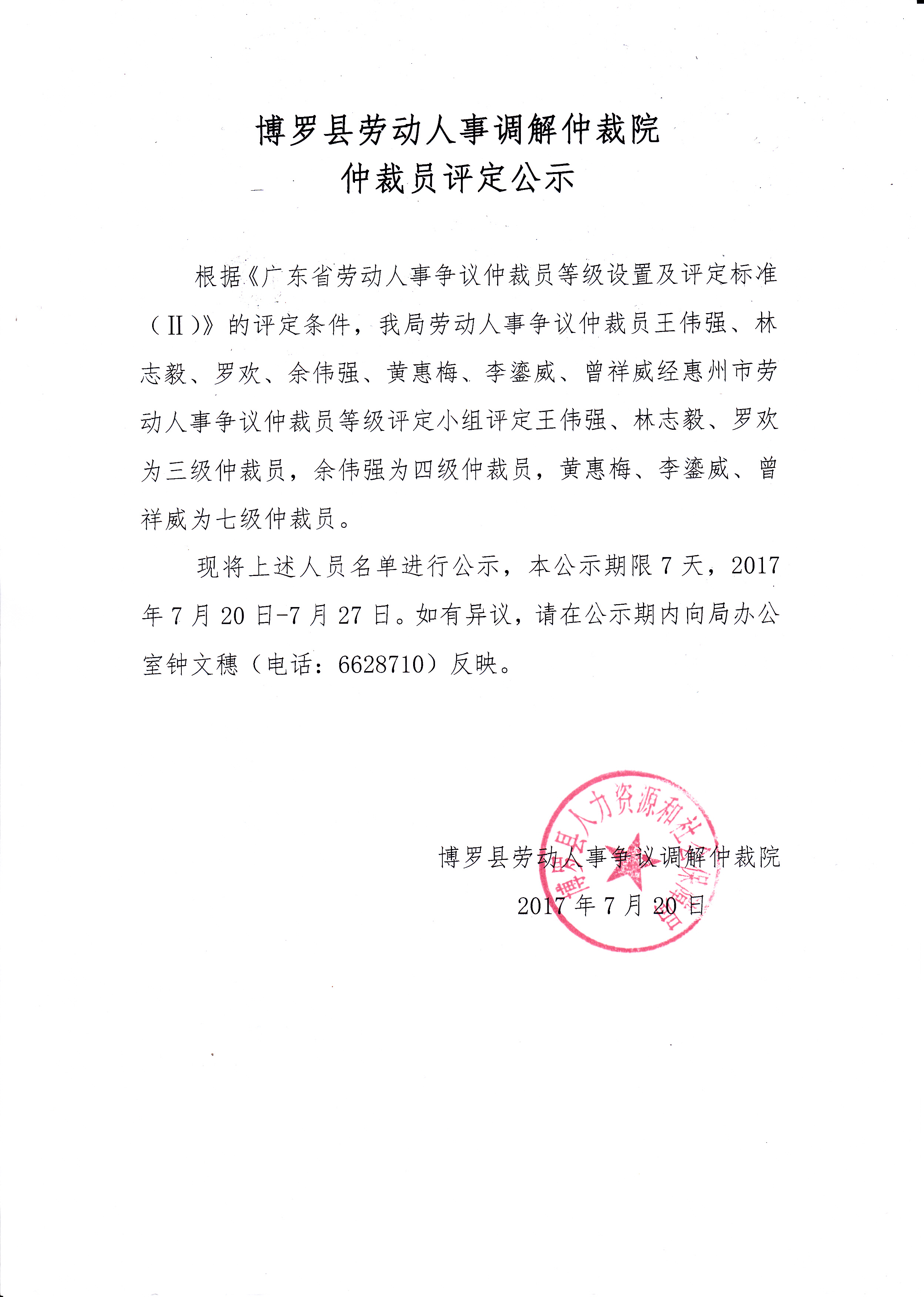 中文博彩平台劳动人事调解仲裁院仲裁员评定公示