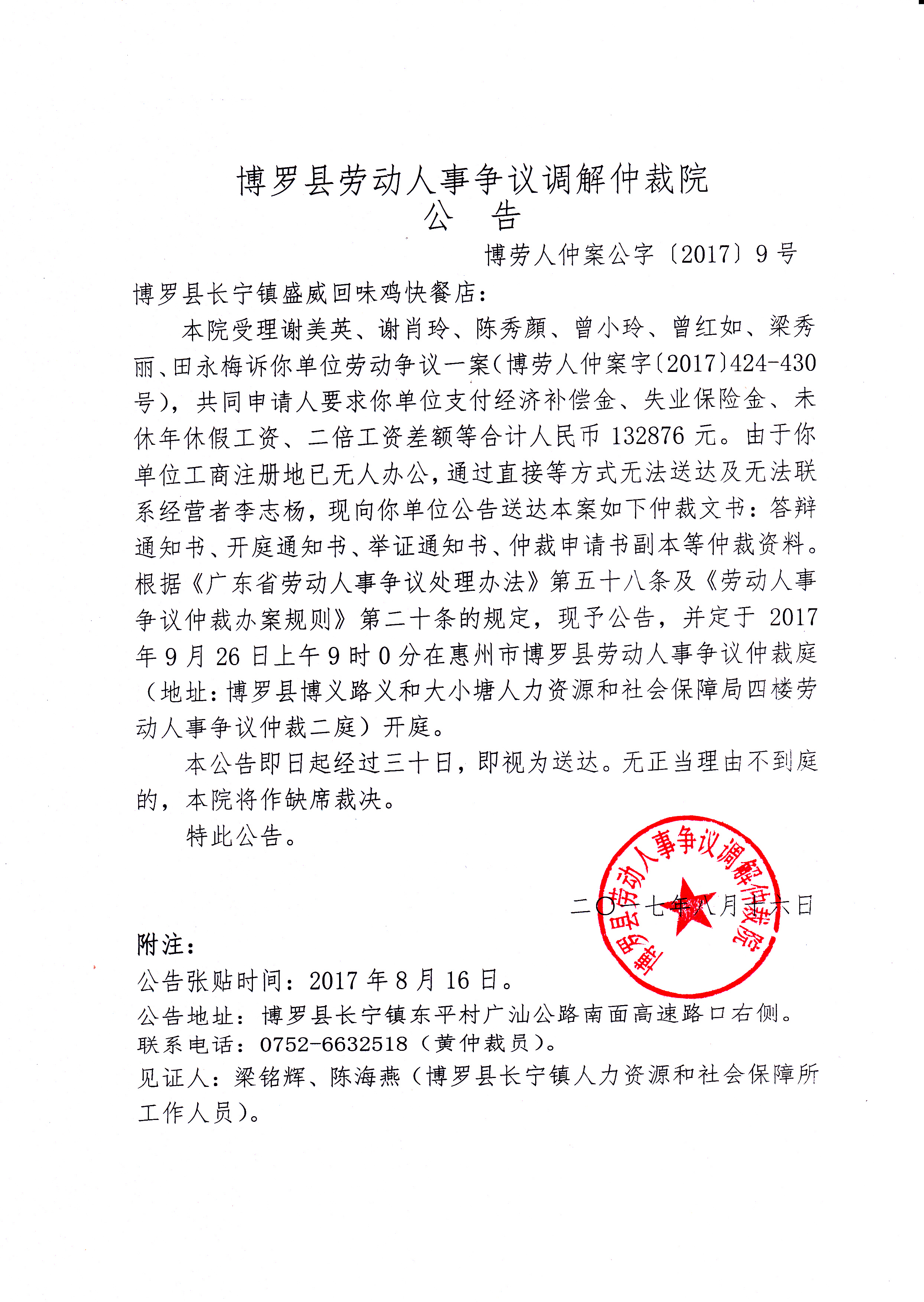 中文博彩平台劳动人事争议调解仲裁院公告 (博劳人仲案公字[2017]9号)