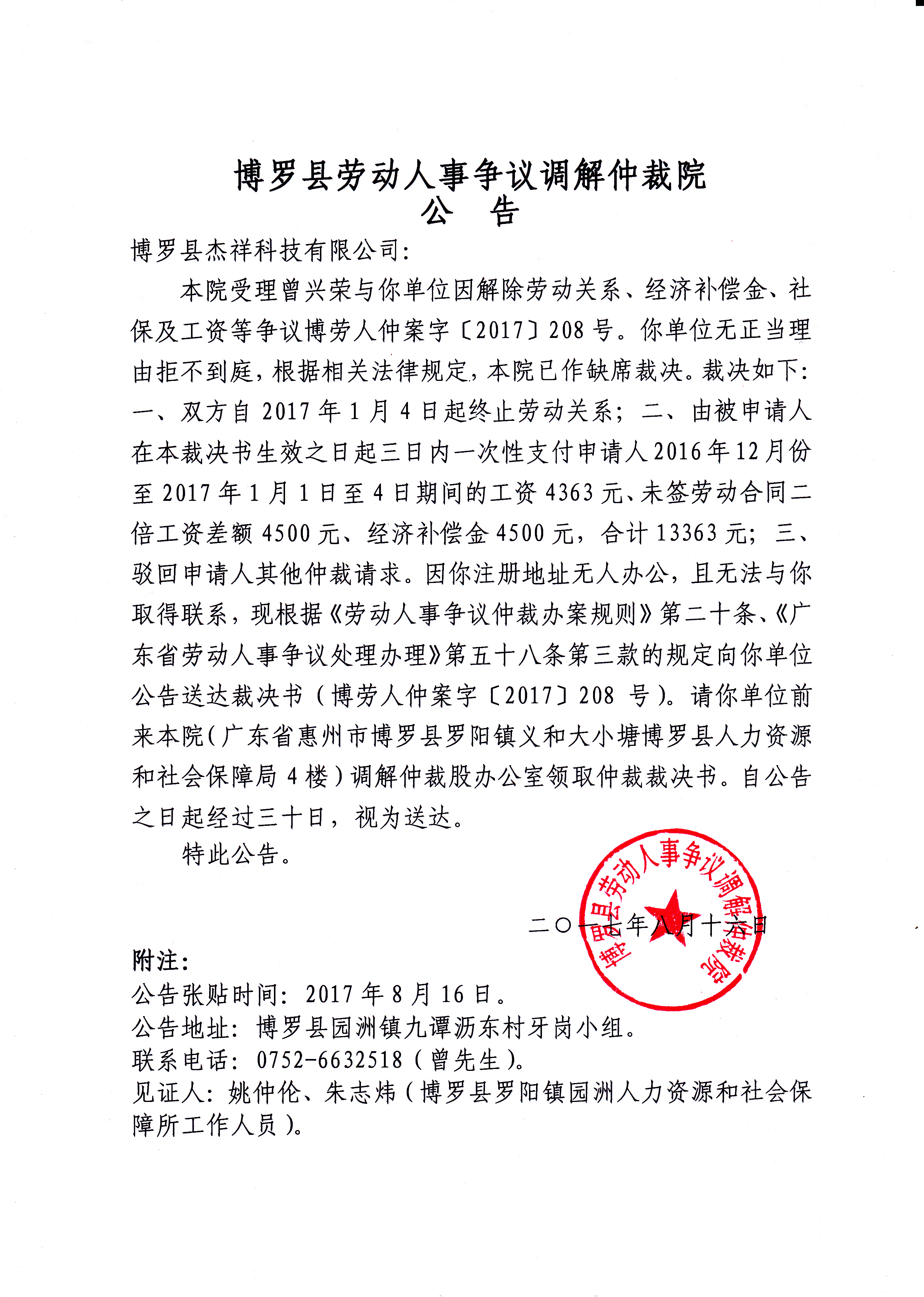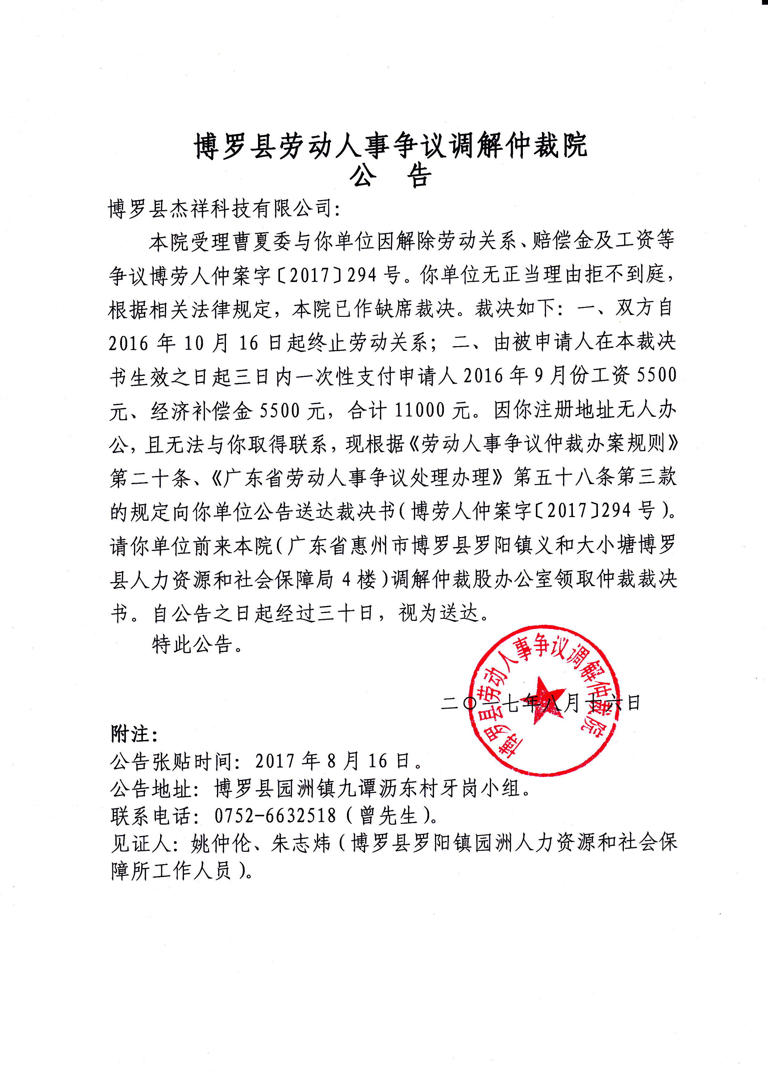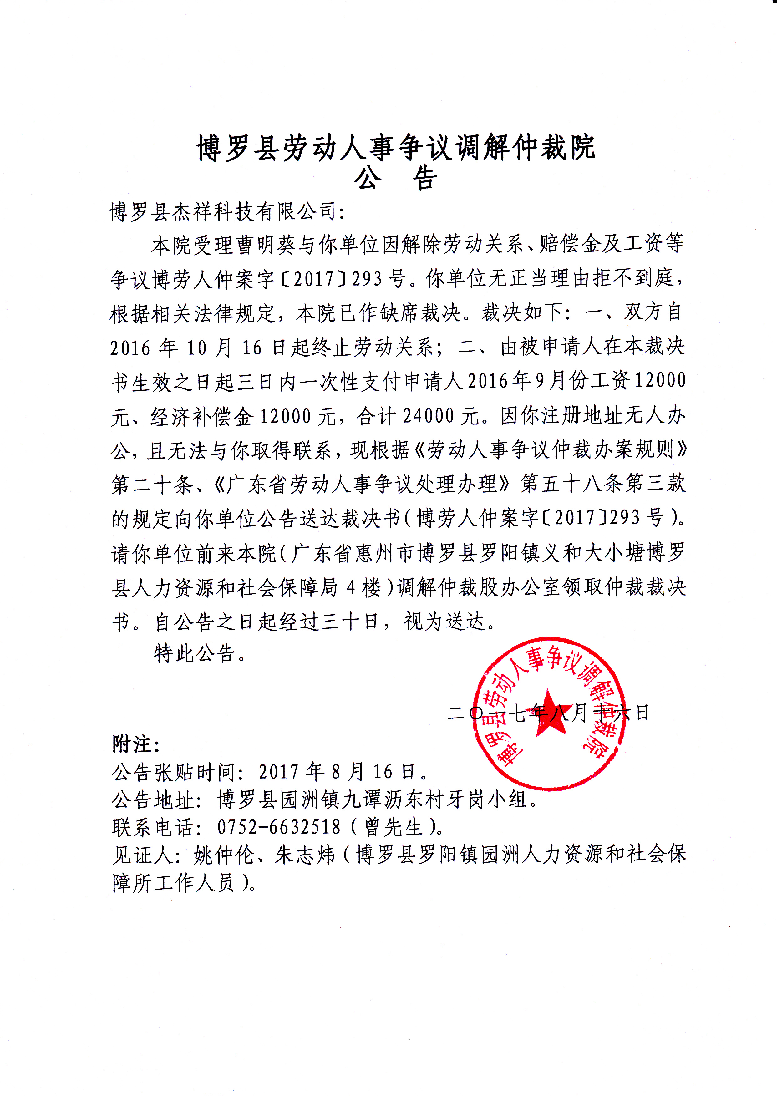 中文博彩平台劳动人事争议调解仲裁院公告(中文博彩平台杰祥科技有限公司)