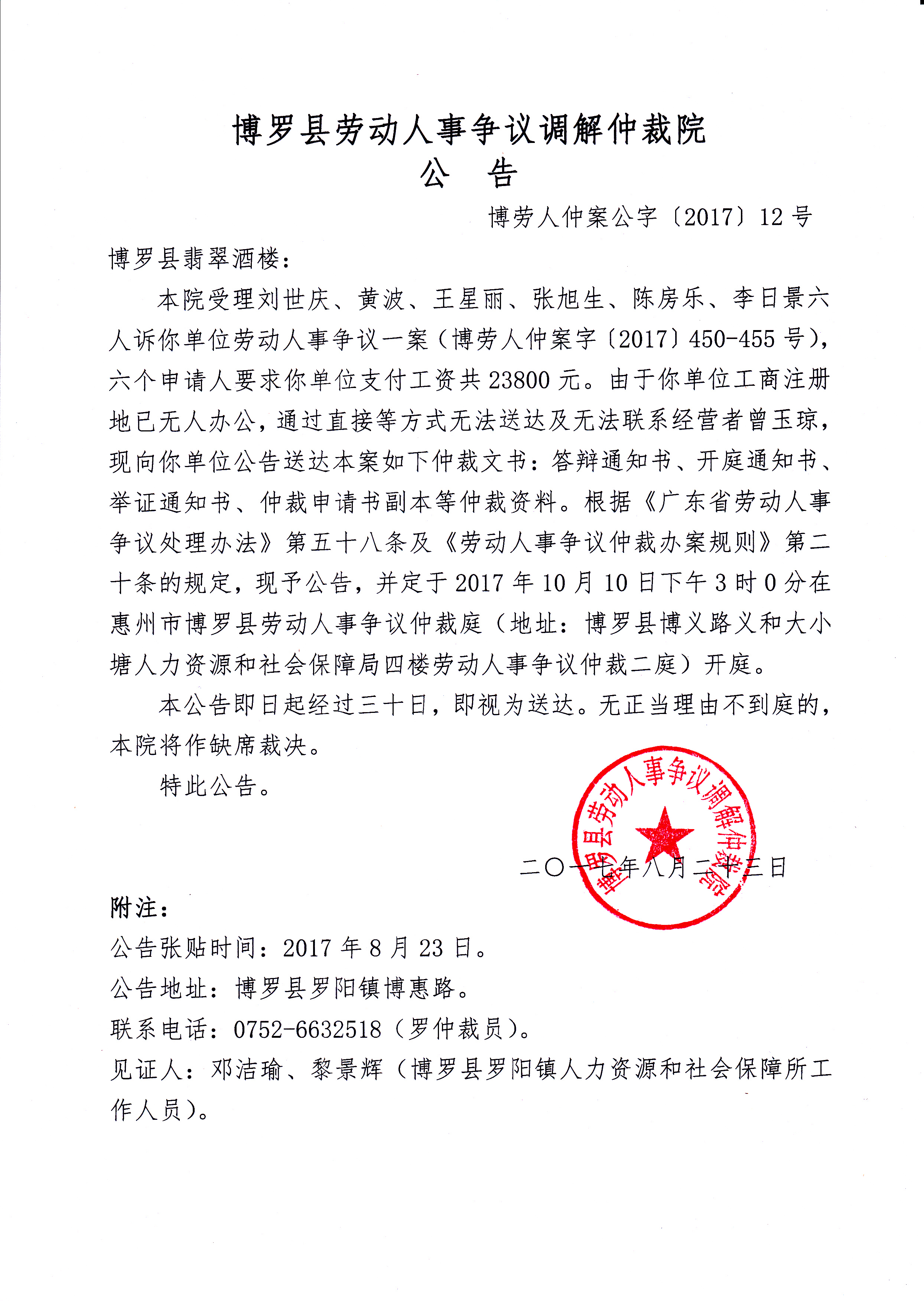 中文博彩平台劳动人事争议调解仲裁院公告(博劳人仲案公字[2017]12号)