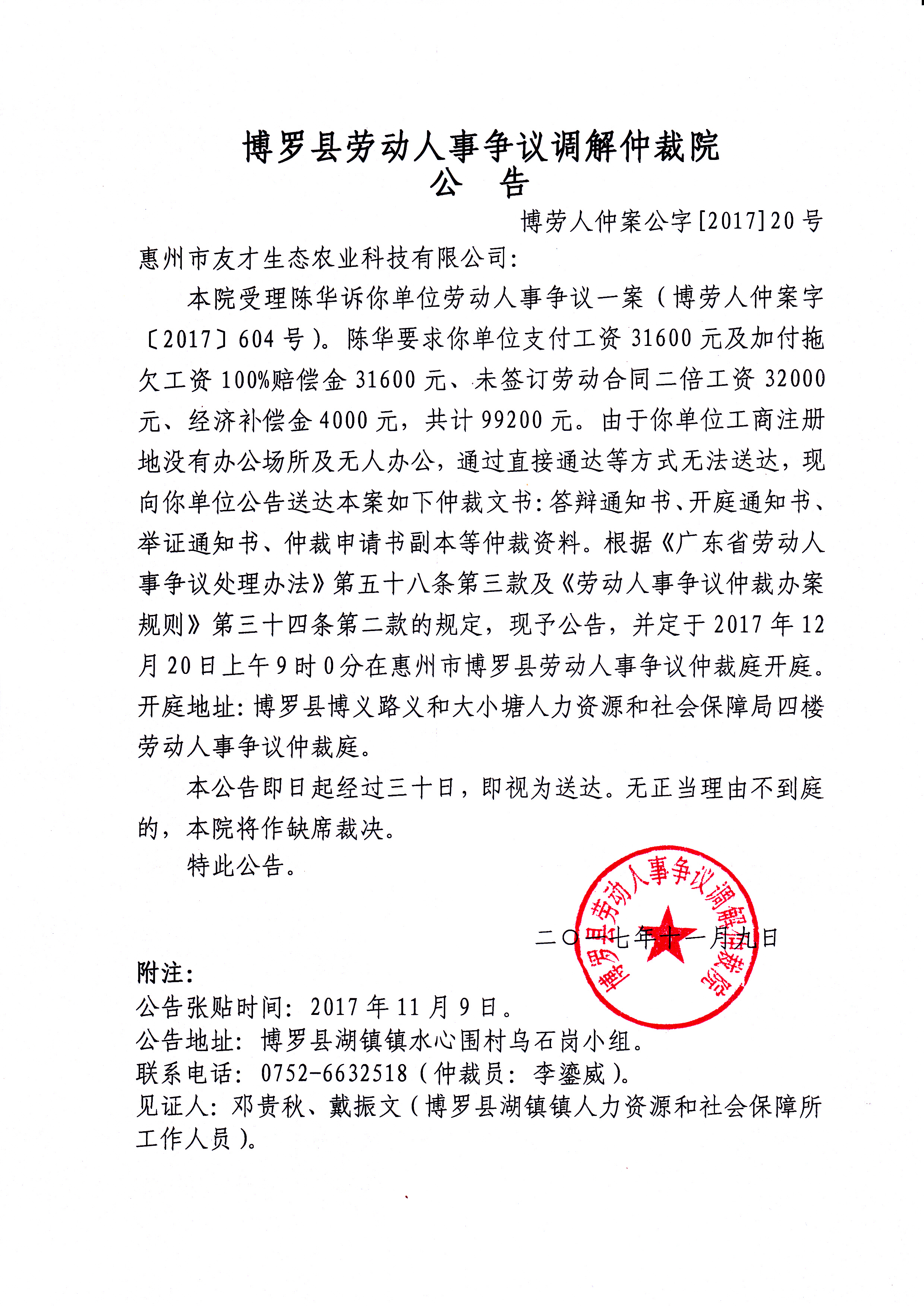 中文博彩平台劳动人事争议调解仲裁院公告(博劳人仲案公字[2017]20号)
