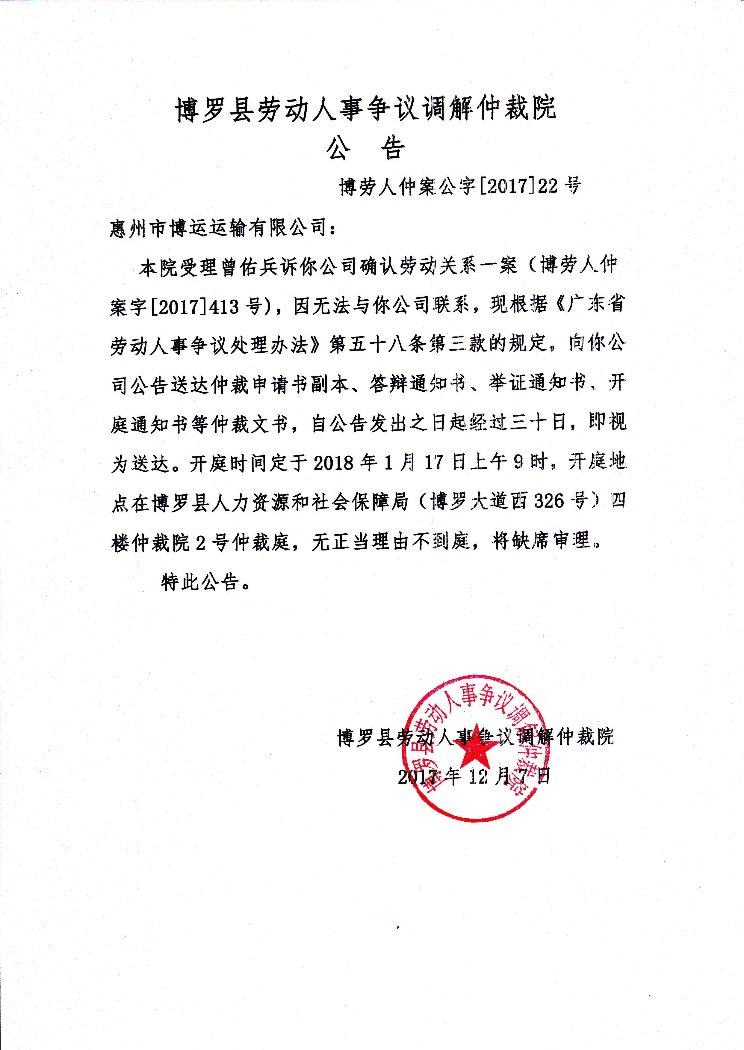中文博彩平台劳动人事争议调解仲裁院公告(博劳人仲案公字[2017]22号)