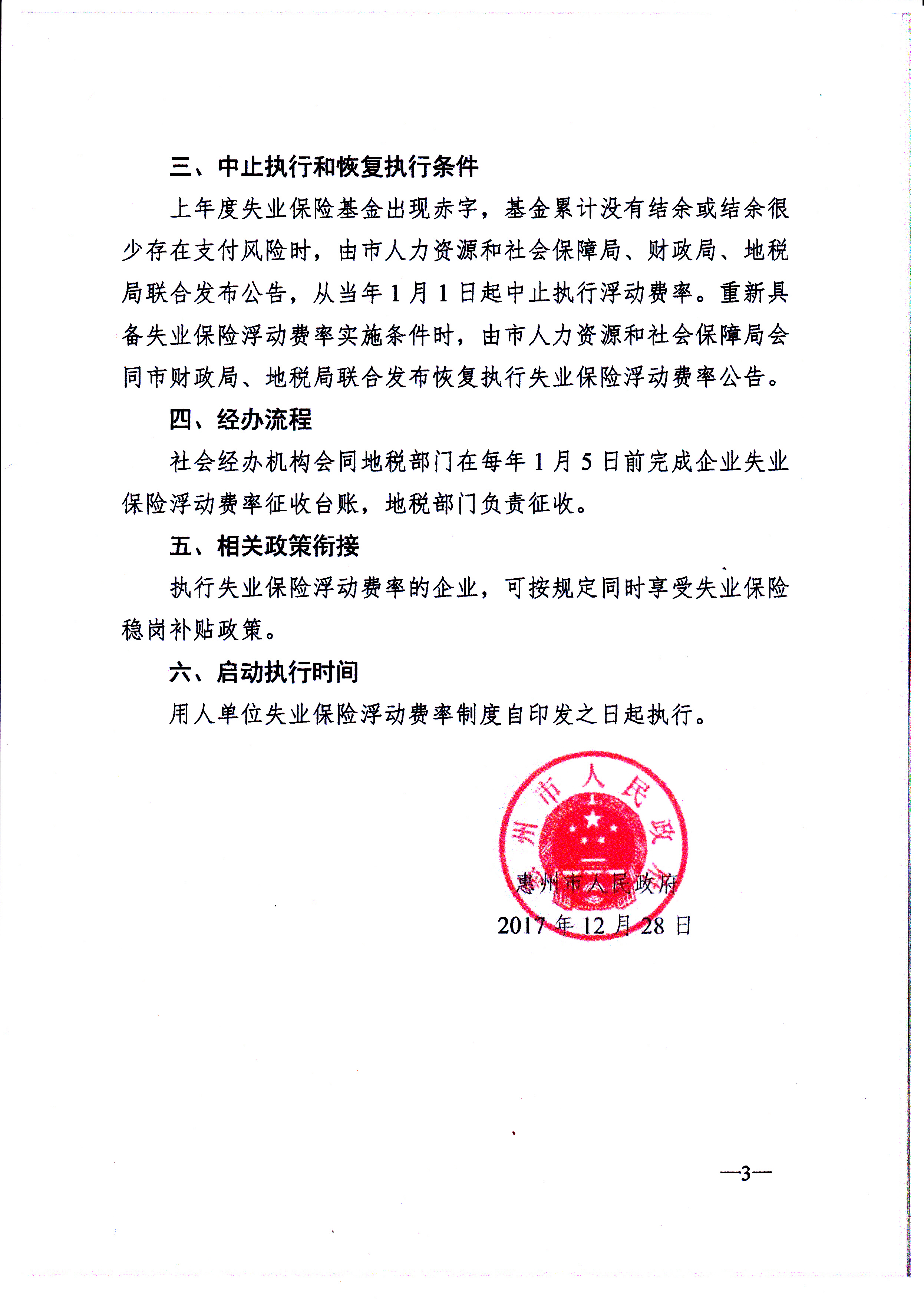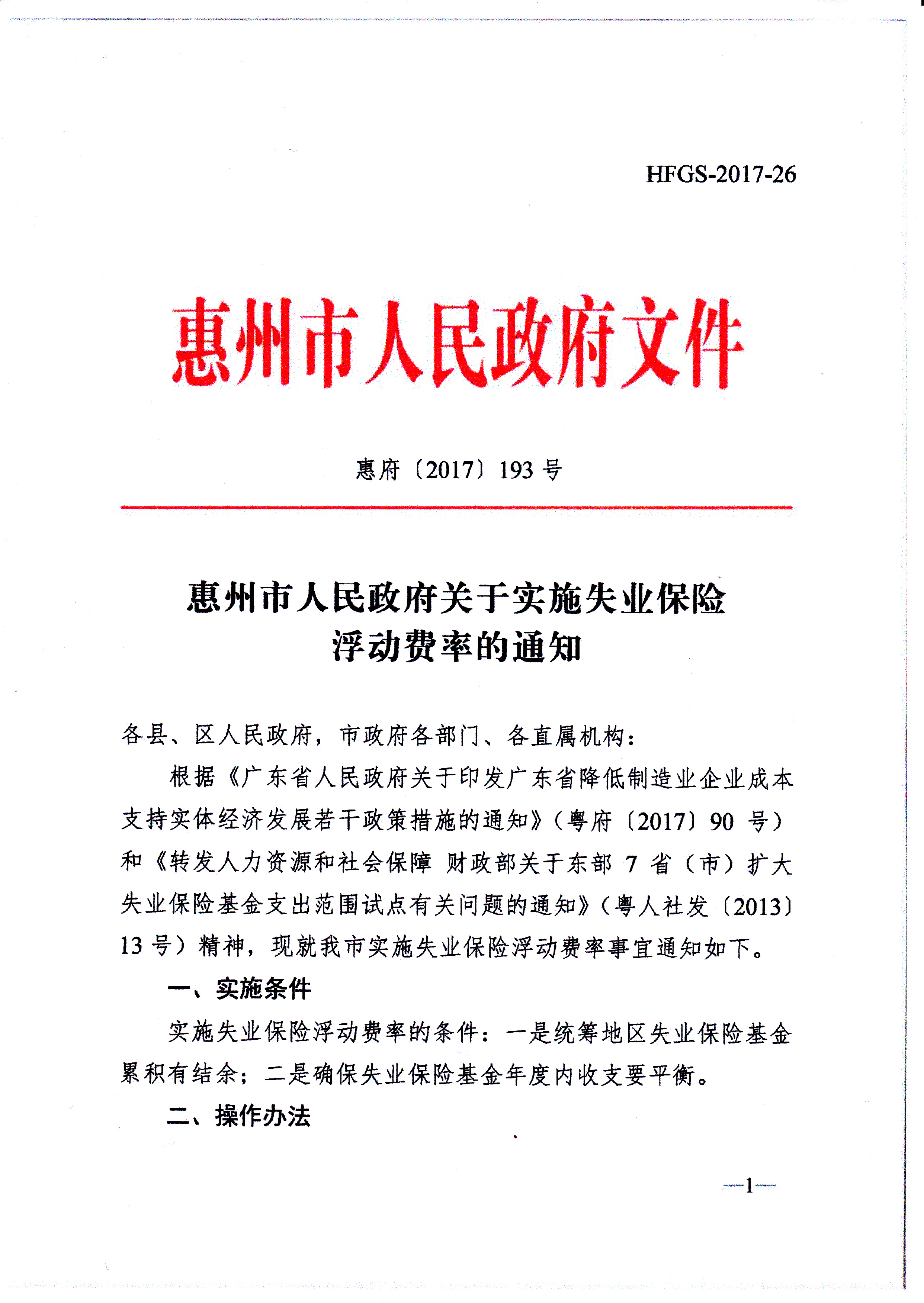 惠州市人民政府关于实施失业保险浮动费率的通知