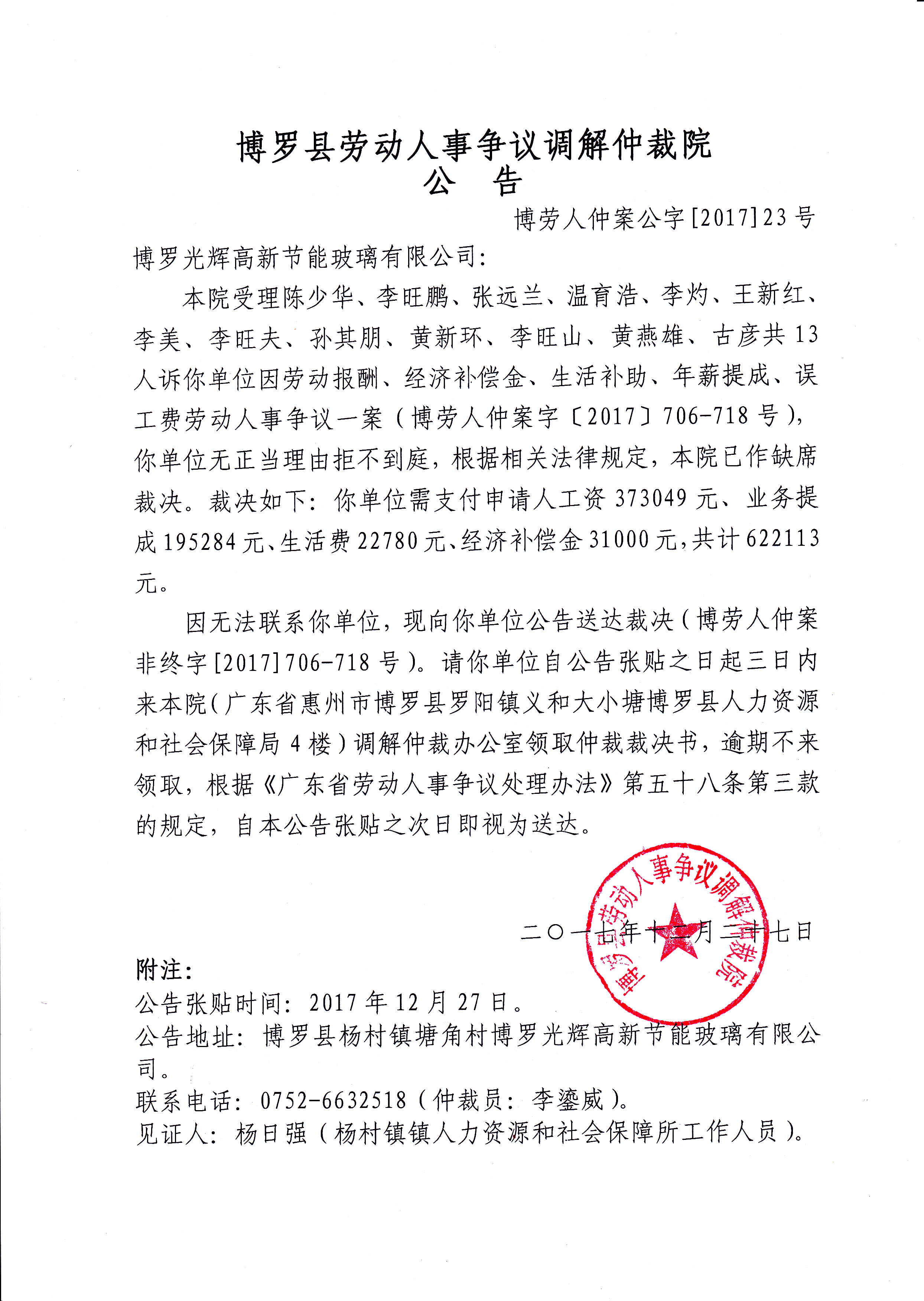 中文博彩平台劳动人事争议调解仲裁院公告(博劳人仲案公字[2017]23号)