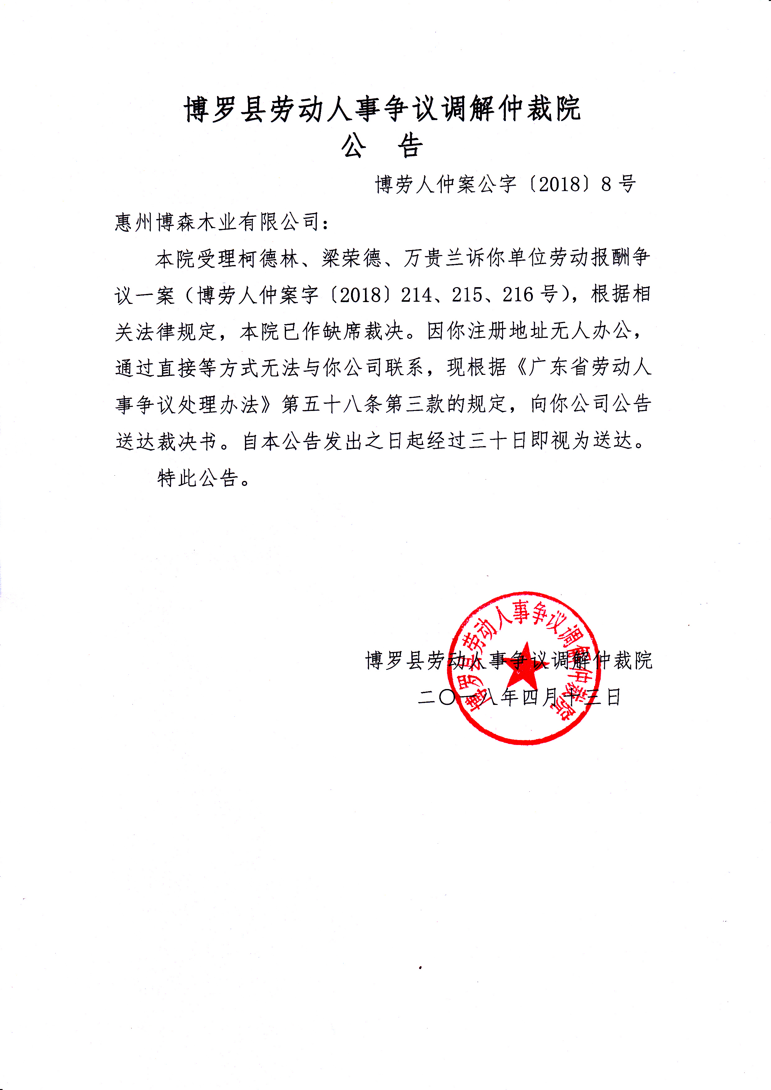 中文博彩平台劳动人事争议调解仲裁院公告(博劳人仲案公字[2018]8号)
