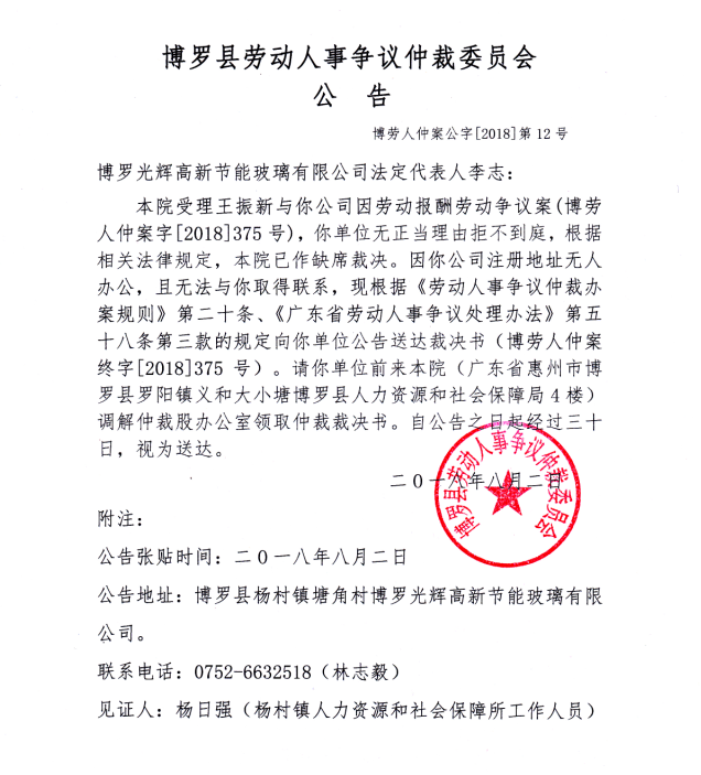中文博彩平台劳动人事争议仲裁委员会公告(博劳人仲案公字[2018]12号)