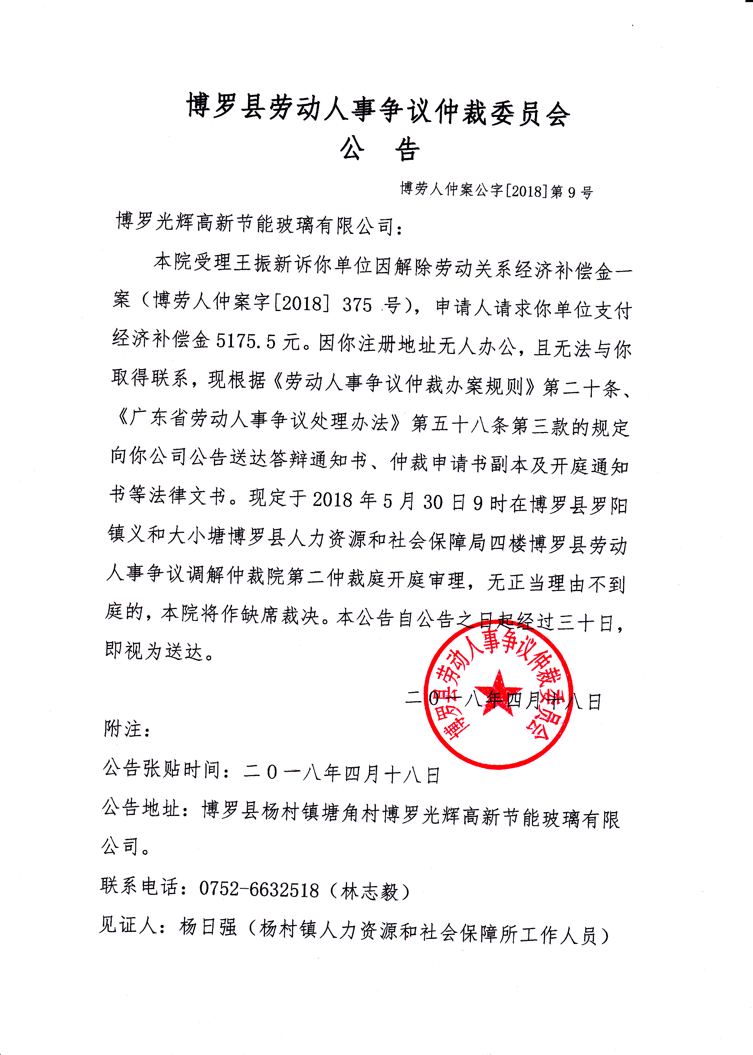 中文博彩平台劳动人事争议调解仲裁院公告(博劳人仲案公字[2018]9号)
