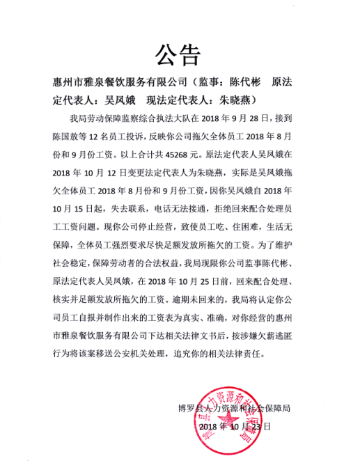 通知用人单位配合处理欠薪案件的公告(惠州市雅泉餐饮服务有限公司)