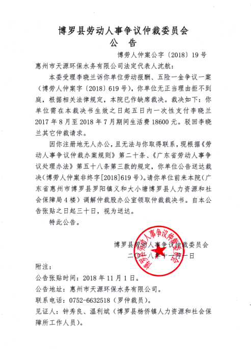 中文博彩平台劳动人事争议仲裁委员会公告(博劳人仲案公字[2018]19号)