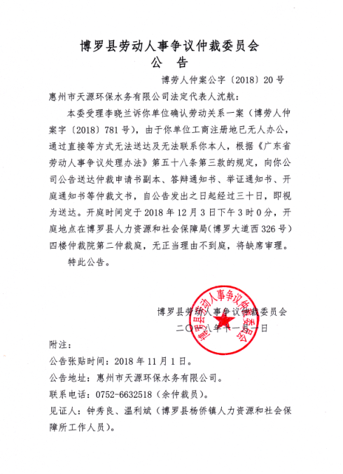 中文博彩平台劳动人事争议仲裁委员会公告(博劳人仲案公字[2018]20号)