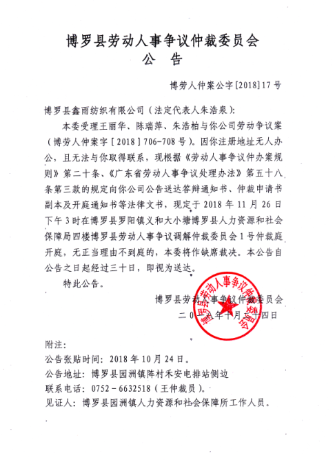 中文博彩平台劳动人事争议仲裁委员会公告(博劳人仲案公字[2018]17号)