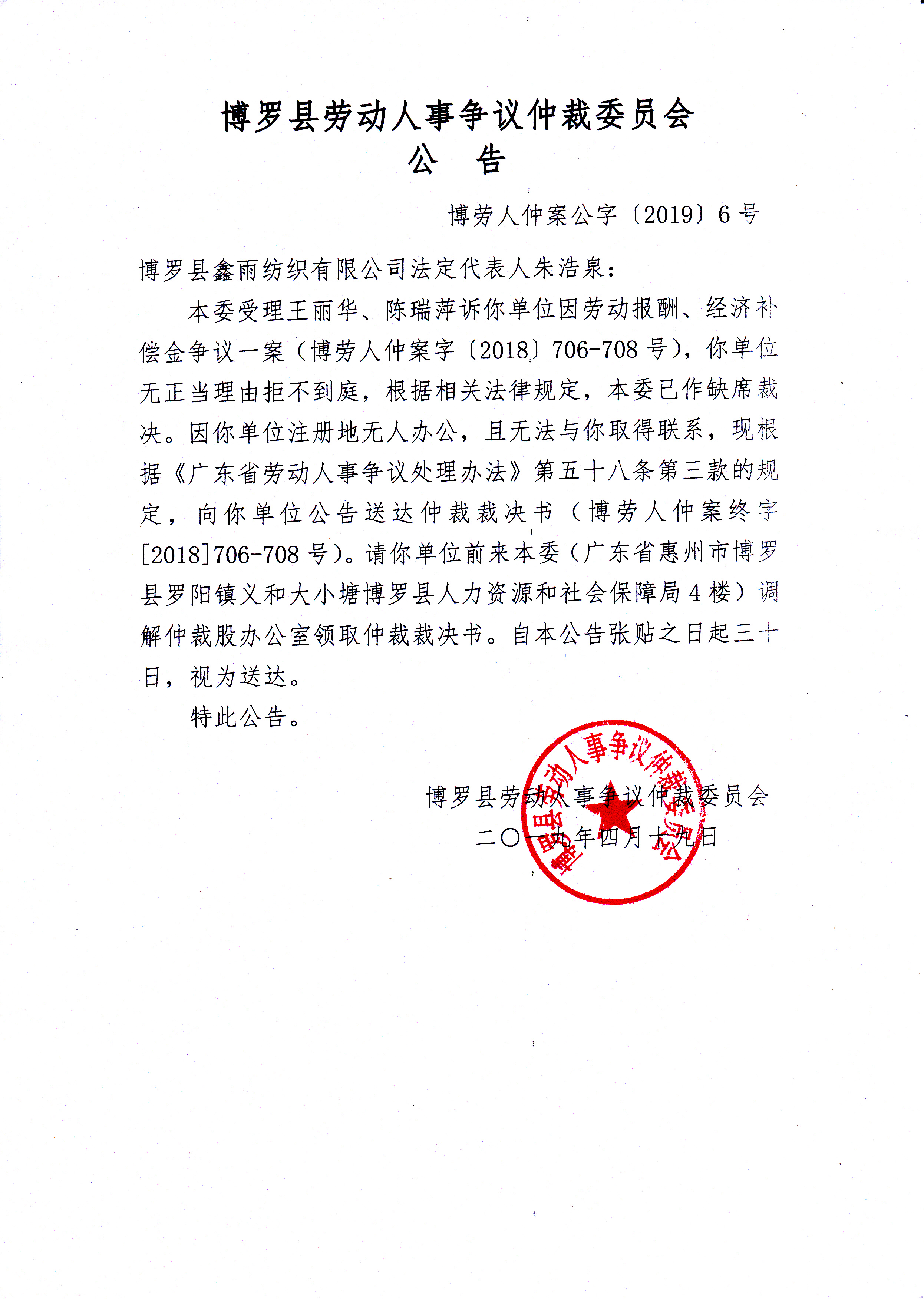 中文博彩平台劳动人事争议仲裁委员会公告(博劳人仲案公字[2019]6号)