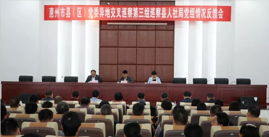 3月16日上午,惠州市县(区)党委异地交叉巡察第三组巡察县人社局党组情况反馈会在局十一楼会议室召开,局党组书记、局长黄惠明主持会议。县委常委、组织部长、县委巡察工作领导小组副组长潘智,异地交叉巡察第三组组长陈燕玲,县委巡察办副主任喻滔,县纪委派驻县政府系统纪检组工作人员出席了会议。县人社局领导班子全体成员,机关各股室全体干部职工,下属各中心正副主任,各人社所正副所长共约150人参加了会议。