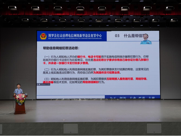 宣传活动以讲座形式开展,民警向广大师生现场分享了学生群体中高发的电信网络诈骗案例,详细讲解反诈知识和技巧,提醒同学们不要将自己的手机卡、银行卡、支付账户等出租、出借、出售给他人,“贩卖‘两卡’将导致无法办理贷款,特别是在校学生,还将对本人今后就业产生不良影响。”