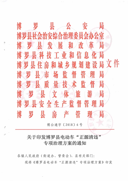 为认真贯彻落实省、市、县领导批示精神,深刻吸取近年来电动车火灾事故教训,加强电动车火灾防范,预防和遏制电动车火灾事故发生,根据省公安厅、省综治办、省发改委、省经信委、省住建局、省工商局、省质监局、省新闻出版广电局、省安监局联合印发的《广东省电动车“正源清违”专项治理方案》(粤公通字〔2018〕68号)和市公安局、市综治办、市发改局、市经信局、市住建局、市工商局、市质监局、市广电新闻出版局、市安监局联合印发的《惠州市电动车“正源清违”专项治理方案》(惠市公通字〔2018〕217号)要求,决定在全县范围内部署开展电动车“正源清违”专项治理行动,具体工作方案如下:
