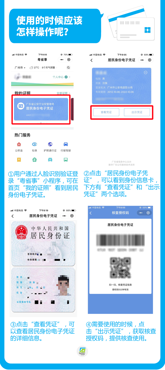 广东省公安厅有关负责人表示,广东推出的居民身份电子凭证可用于核实持证人身份信息。广东省公安机关将积极向社会有关部门提供全省居民身份电子凭证核查服务,方便群众使用居民身份电子凭证办理相关事务。