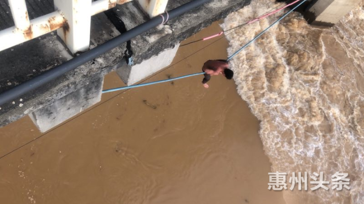 一男子悬挂半空,脚下江水湍急,后幸被消防员和民警合力营救上来。