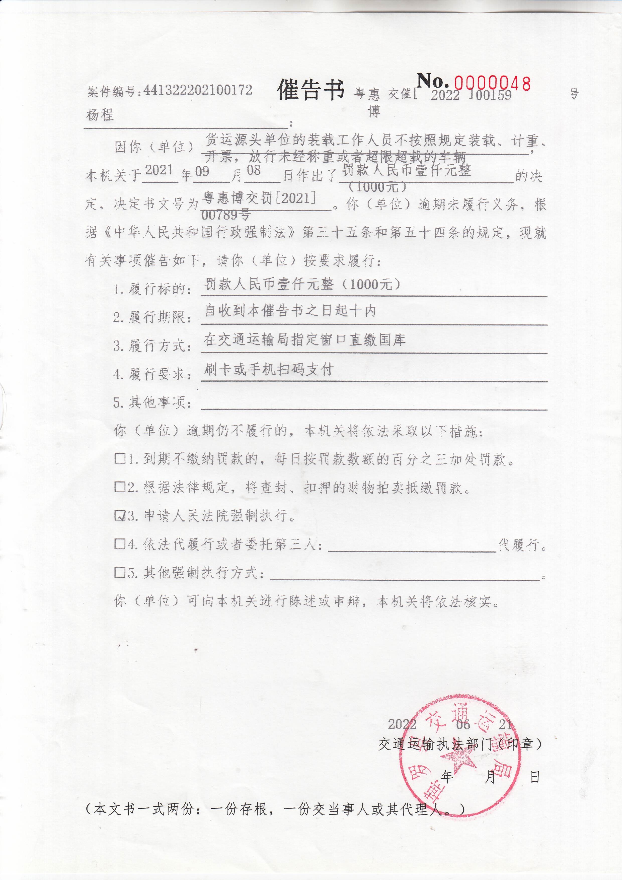 一、佛山市顺德区城信机械租赁有限公司的司磅员杨程不按照规定放行超限超载车辆案,本机关于2021年09月08日作出了罚款人民币壹仟元整(1000元)的决定,决定书文号为:惠博交罚[2021]00789号),但你在本机关决定的期限内不履行义务。