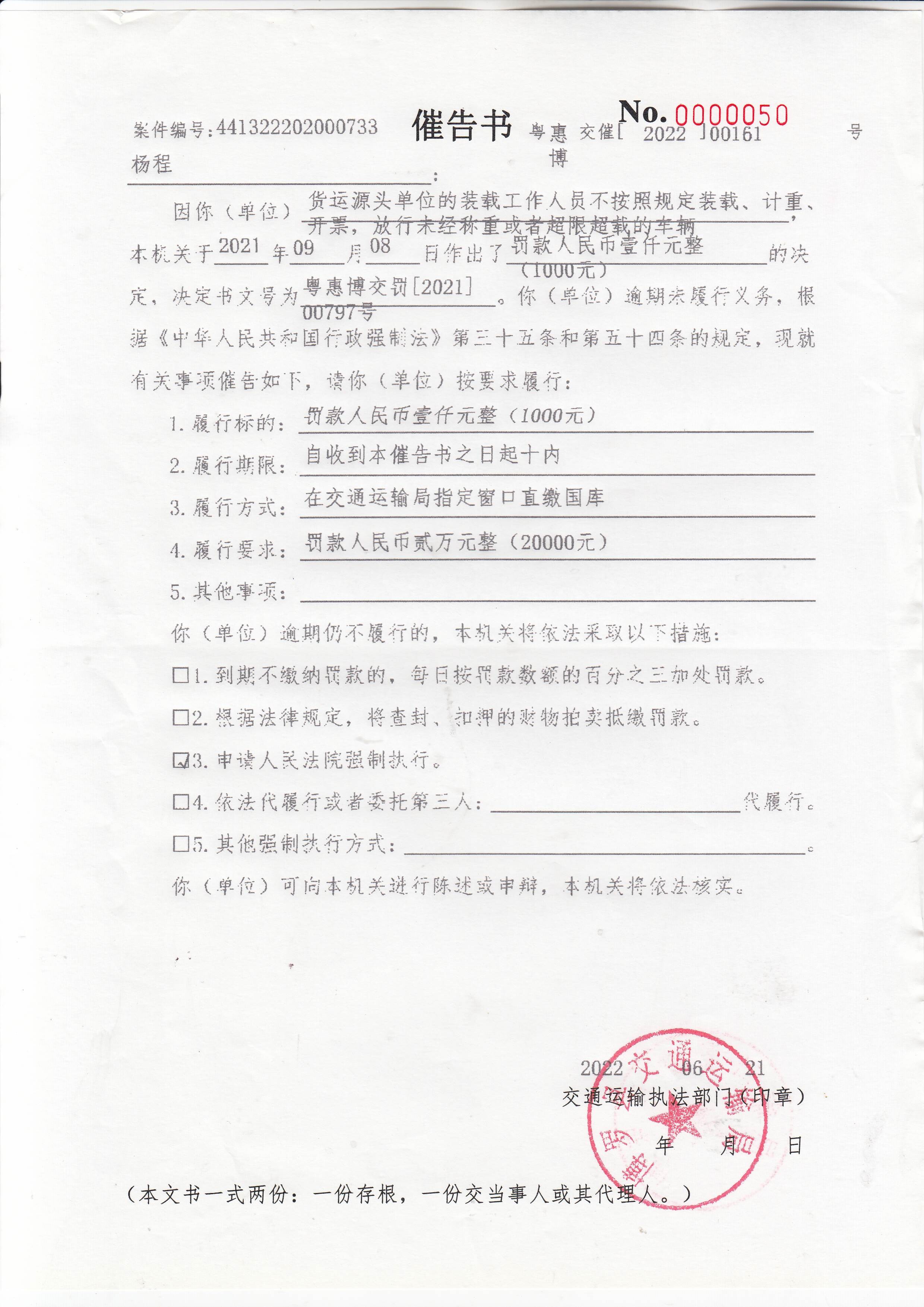 一、佛山市顺德区城信机械租赁有限公司的司磅员杨程不按照规定放行超限超载车辆案,本机关于2021年09月08日作出了罚款人民币壹仟元整(1000元)的决定,决定书文号为:惠博交罚[2021]00797号,但你在本机关决定的期限内不履行义务。