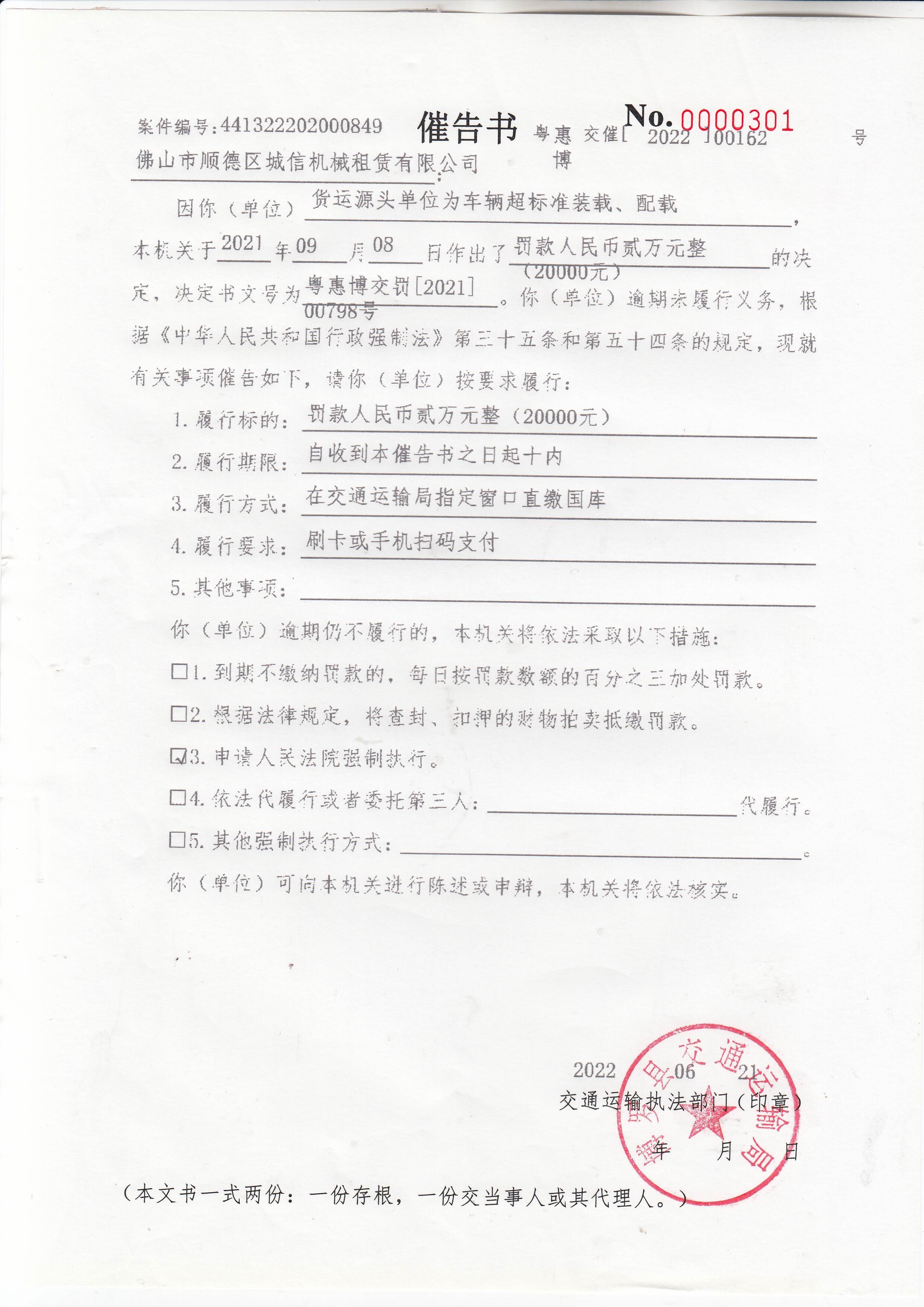 一、佛山市顺德区城信机械租赁有限公司货运源头单位为车辆超标准装载、配载案,本机关于2021年09月08日作出了罚款人民币贰万元整(20000元)的决定,决定书文号为:惠博交罚[2021]00798号,但你公司在本机关决定的期限内不履行义务。
