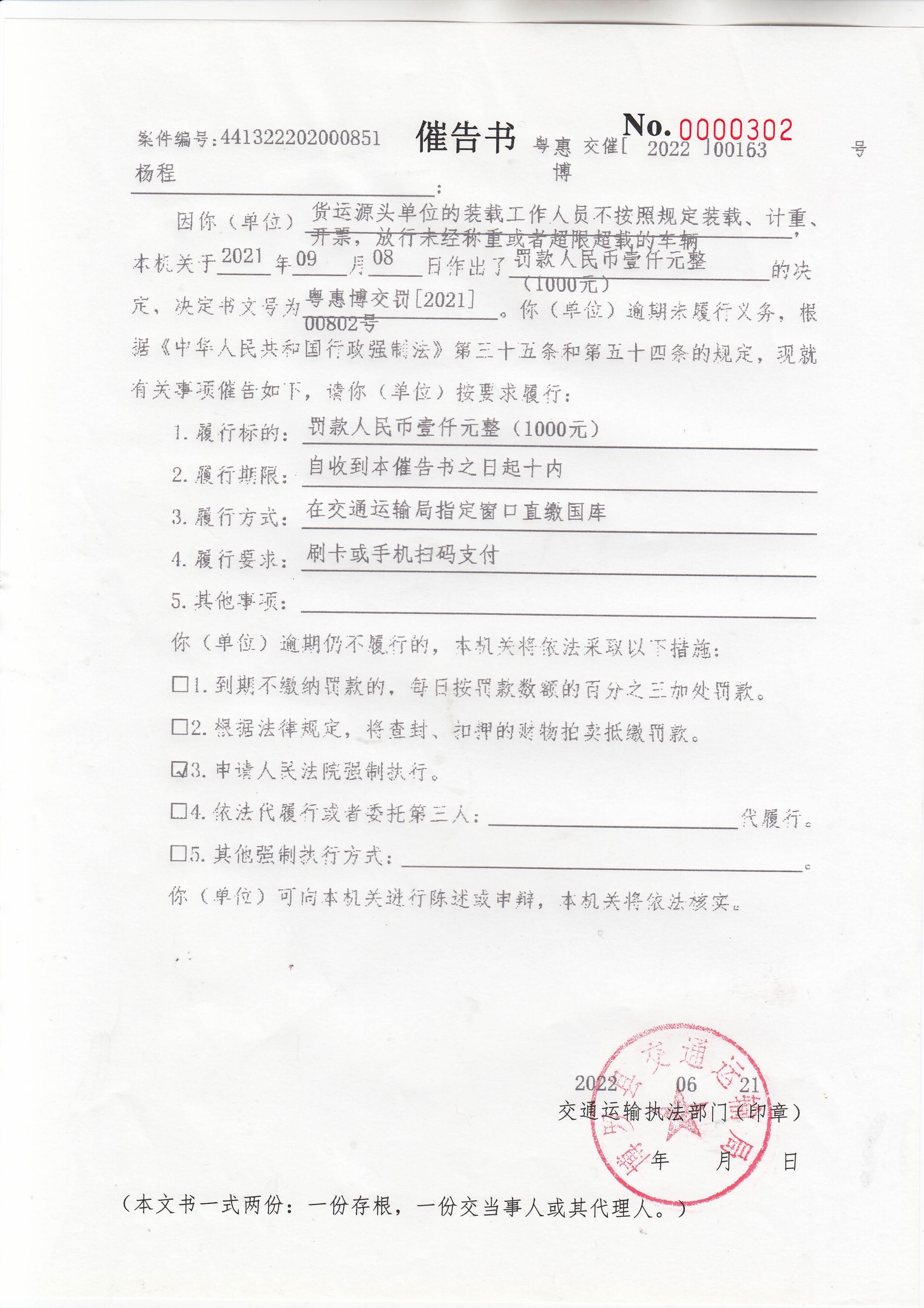 一、佛山市顺德区城信机械租赁有限公司的司磅员杨程不按照规定放行超限超载车辆案,本机关于2021年09月08日作出了罚款人民币壹仟元整(1000元)的决定,决定书文号为:惠博交罚[2021]00802号,但你在本机关决定的期限内不履行义务。