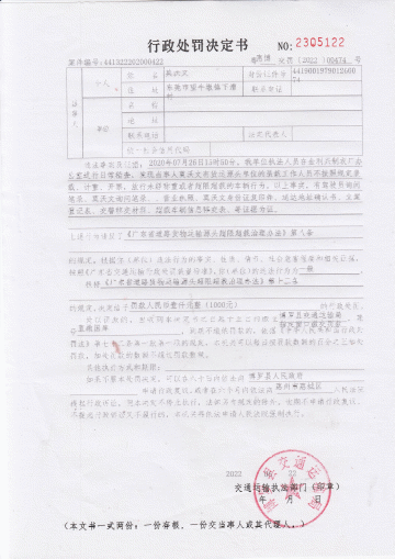 2020年07月26日15时50分,我单位执法人员在金利兴制衣厂办公室进行日常稽查,发现当事人莫沃文有货运源头单位的装载工作人员不按照规定装载、计重、开票,放行未经称重或者超限超载的车辆行为。以上事实,有驾驶员询问笔录、莫沃文询问笔录、营业执照、莫沃文身份证复印件、送达地址确认书、立案登记表、交警移交材料、超载车辆信息移交表、等证据为证。违反了《广东省道路货物运输源头超限超载治理办法》第八条的规定,的规定,依据《广东省道路货物运输源头超限超载治理办法》第十三条的规定。我局决定给予你下列行政处罚:罚款:1000元。我局通过直接送达、邮寄送达等方式无法送达《行政处罚决定书》,现依法向你公告送达《行政处罚决定书》【编号:惠博交罚〔2022〕00474号】,限你自公告之日起30日内到我局领取《行政处罚决定书》(中文博彩平台罗阳街道中文博彩平台大道中685号),逾期则视为送达。