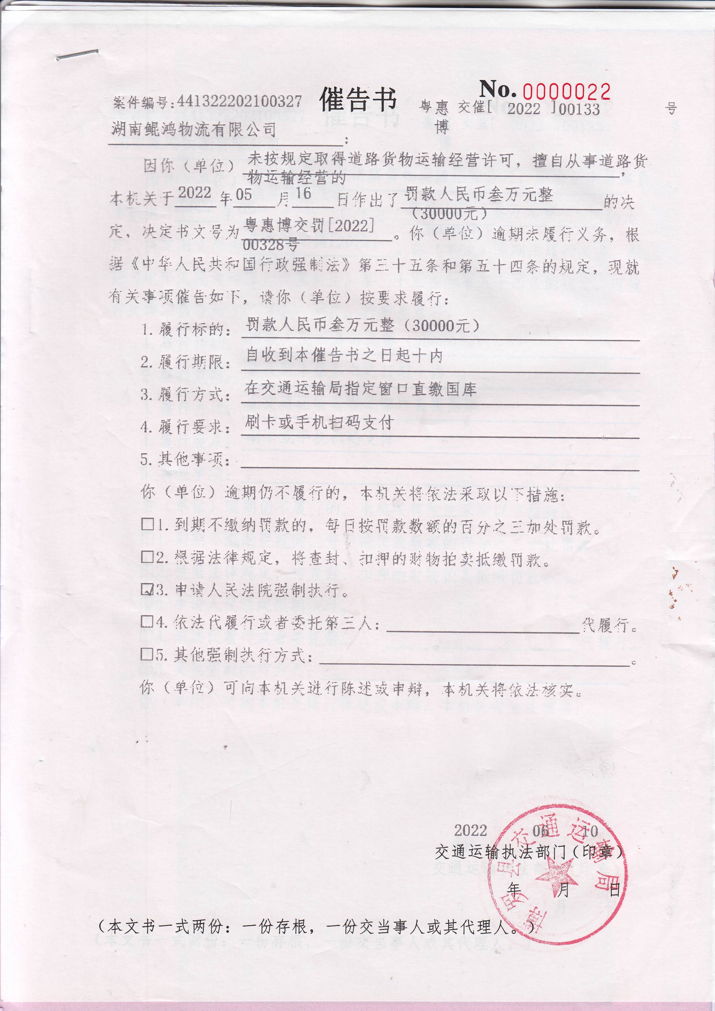 一、你公司使用湘J57119/湘J3813挂重型货车未取得道路货物运输经营许可,擅自从事道路货物运输经营案,本机关于2022年05月16日作出了罚款人民币叁万元整(30000元)的决定,决定书文号为:惠博交罚[2022]00328号),但你公司在本机关决定的期限内不履行义务。