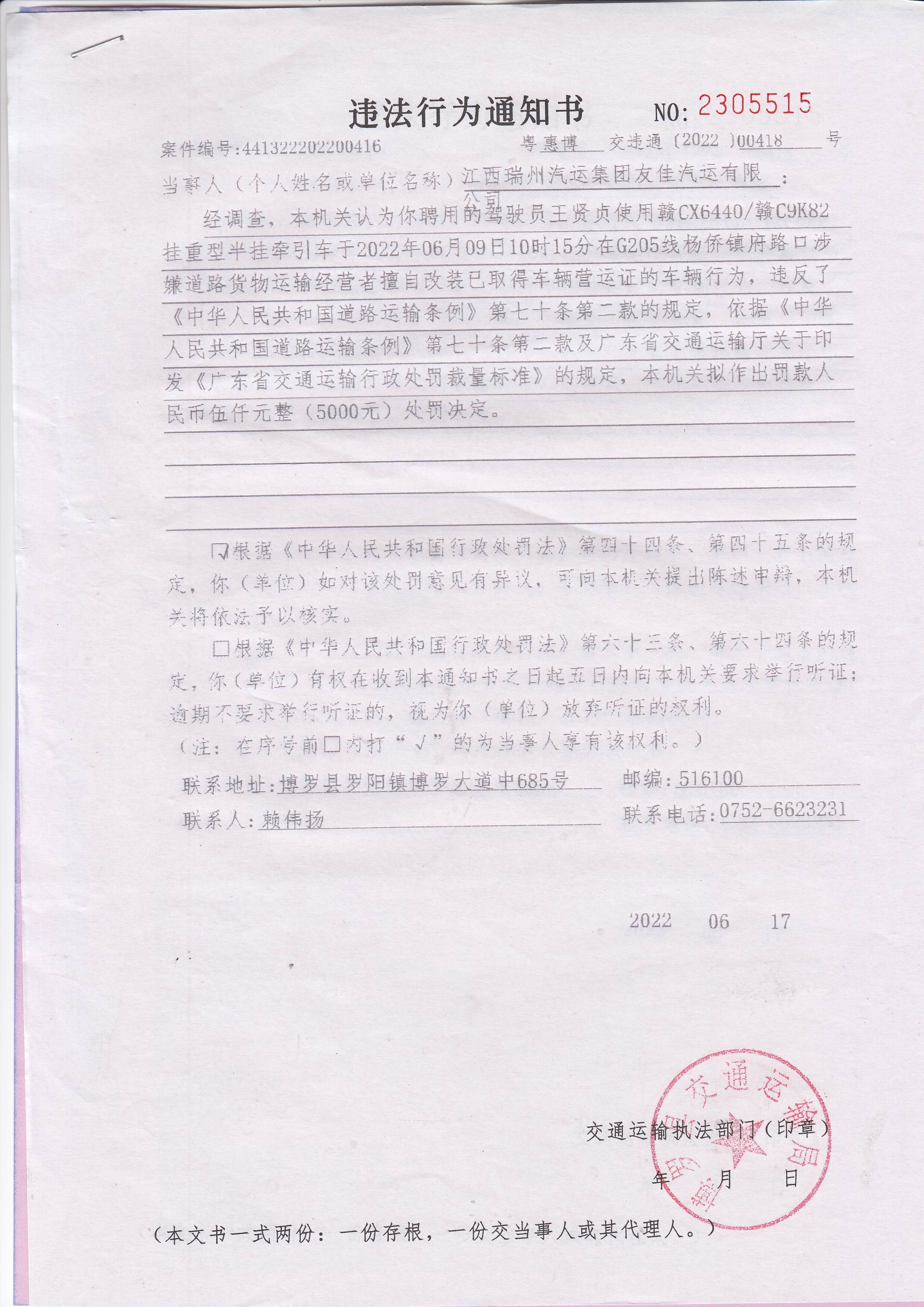 经本机关依法查明,认为你公司聘用的驾驶员王贤贞使用赣CX6440/赣C9K82挂重型半挂牵引车于2022年06月09日10时15分在G205线杨侨镇政府路口涉嫌道路货物运输经营者擅自改装已取得车辆营运证的车辆行为,违反了《中华人民共和国道路运输条例》第七十条第二款的规定,依据《中华人民共和国道路运输条例》第七十条第二款及广东省交通运输厅关于印发《广东省交通运输行政处罚裁量标准》的规定,本机关拟作出罚款人民币伍仟元整(5000元)处罚决定。因其他法定方式无法送达,现依法向你单位公告送达《违法行为通知书》(惠博交字【2022】00418号),自公告之日起30日内来我局(中文博彩平台罗阳街道办事处中文博彩平台大道中685号)签收,逾期视为送达。