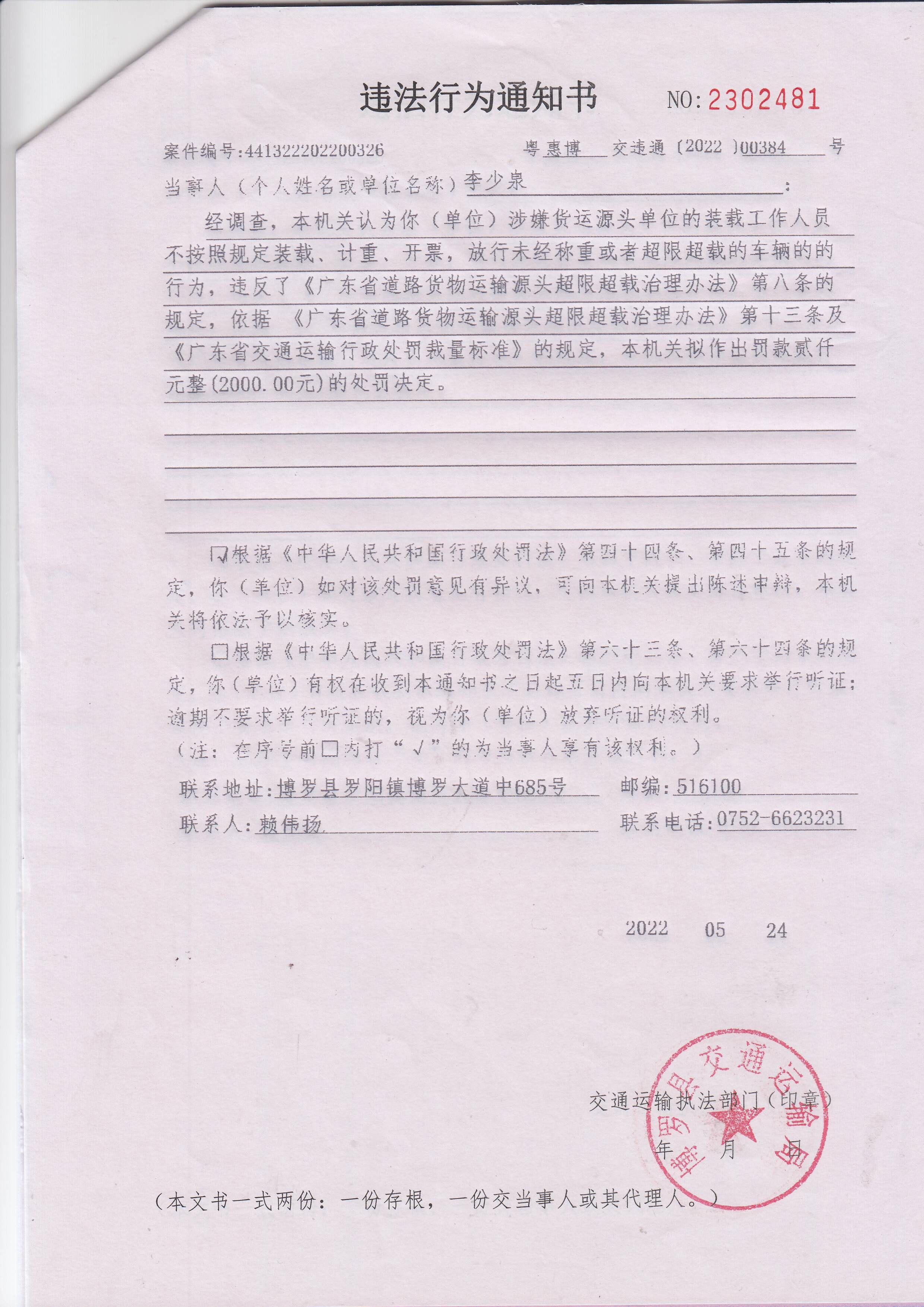经本机关依法查明,认为你涉嫌货运源头单位的装载工作人员不按照规定装载、计重、开票,放行未经称重或者超限超载的车辆的行为,违反了《广东省道路货物运输源头超限超载治理办法》第八条的规定,依据 《广东省道路货物运输源头超限超载治理办法》第十三条及《广东省交通运输行政处罚裁量标准》的规定,本机关拟作出罚款贰仟元整(2000.00元)的处罚决定。因其他法定方式无法送达,现依法向你单位公告送达《违法行为通知书》(惠博交字【2022】00384号),自公告之日起30日内来我局(中文博彩平台罗阳街道办事处中文博彩平台大道中685号)签收,逾期视为送达。