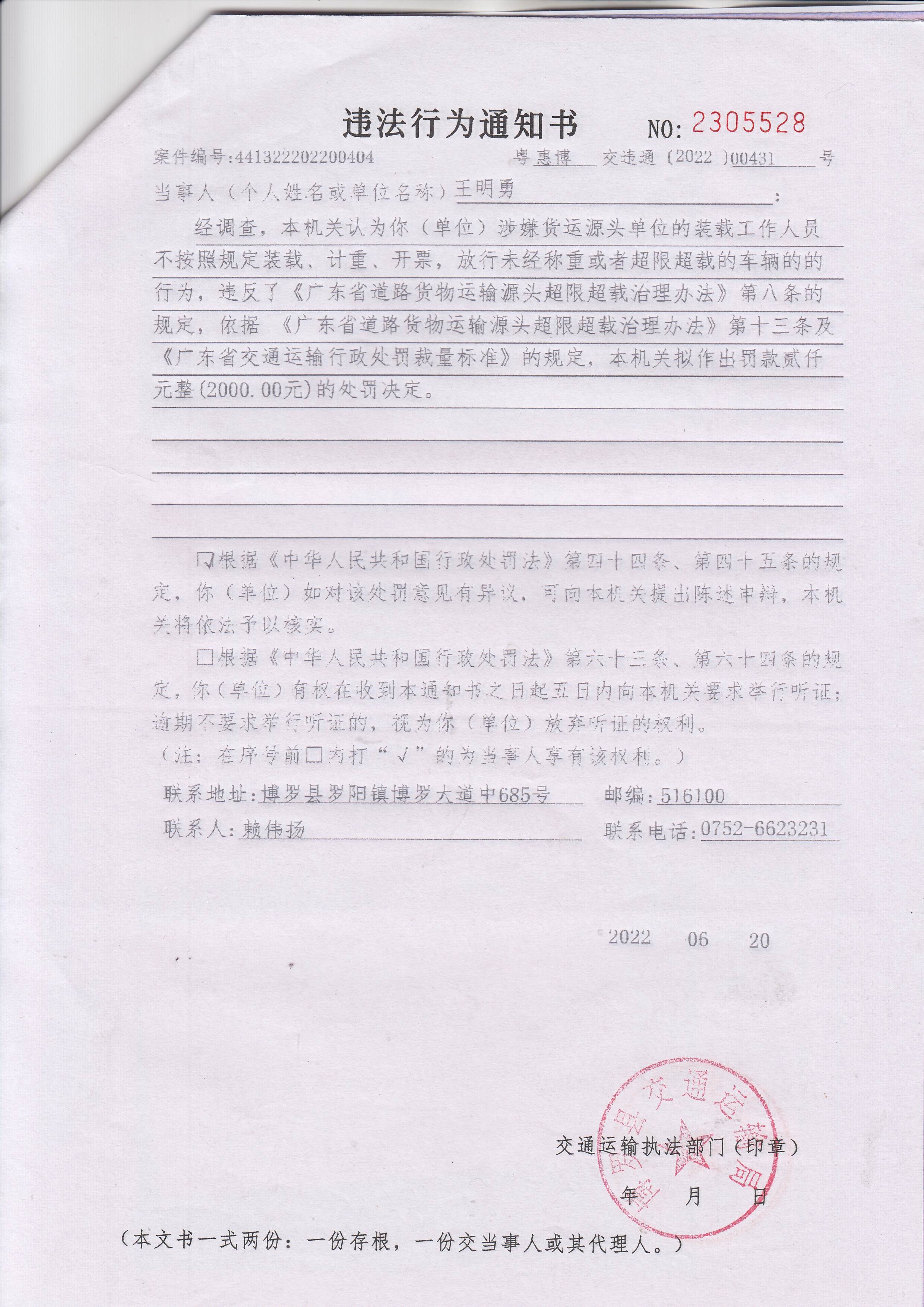 经本机关依法查明,认为你涉嫌货运源头单位的装载工作人员不按照规定装载、计重、开票,放行未经称重或者超限超载的车辆的行为,违反了《广东省道路货物运输源头超限超载治理办法》第八条的规定,依据 《广东省道路货物运输源头超限超载治理办法》第十三条及《广东省交通运输行政处罚裁量标准》的规定,本机关拟作出罚款贰仟元整(2000.00元)的处罚决定。因其他法定方式无法送达,现依法向你单位公告送达《违法行为通知书》(惠博交字【2022】00431号),自公告之日起30日内来我局(中文博彩平台罗阳街道办事处中文博彩平台大道中685号)签收,逾期视为送达。