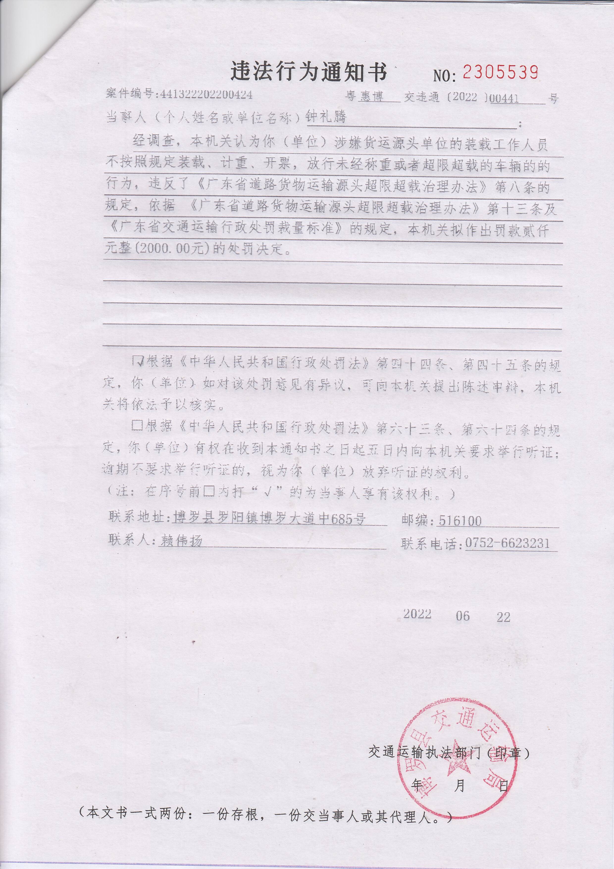 经本机关依法查明,认为你涉嫌货运源头单位的装载工作人员不按照规定装载、计重、开票,放行未经称重或者超限超载的车辆的行为,违反了《广东省道路货物运输源头超限超载治理办法》第八条的规定,依据 《广东省道路货物运输源头超限超载治理办法》第十三条及《广东省交通运输行政处罚裁量标准》的规定,本机关拟作出罚款贰仟元整(2000.00元)的处罚决定。因其他法定方式无法送达,现依法向你单位公告送达《违法行为通知书》(惠博交字【2022】00441号),自公告之日起30日内来我局(中文博彩平台罗阳街道办事处中文博彩平台大道中685号)签收,逾期视为送达。