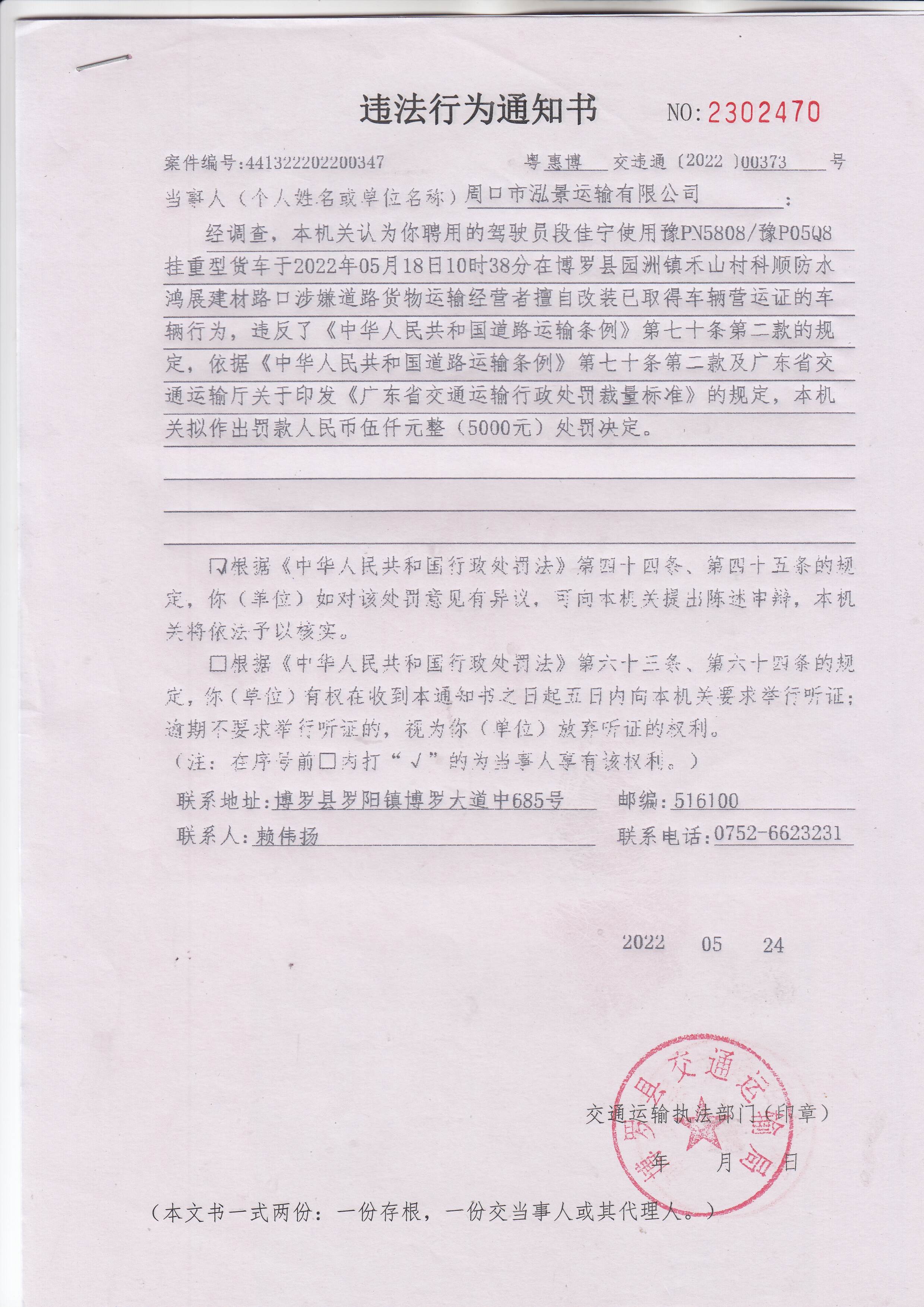 经本机关依法查明,认为你公司聘用的驾驶员段佳宁使用豫PN5808/豫P05Q8挂重型货车于2022年05月18日10时38分在中文博彩平台园洲镇禾山村科顺防水鸿展建材路口涉嫌道路货物运输经营者擅自改装已取得车辆营运证的车辆行为,违反了《中华人民共和国道路运输条例》第七十条第二款的规定,依据《中华人民共和国道路运输条例》第七十条第二款及广东省交通运输厅关于印发《广东省交通运输行政处罚裁量标准》的规定,本机关拟作出罚款人民币伍仟元整(5000元)处罚决定。因其他法定方式无法送达,现依法向你单位公告送达《违法行为通知书》(惠博交字【2022】00373号),自公告之日起30日内来我局(中文博彩平台罗阳街道办事处中文博彩平台大道中685号)签收,逾期视为送达。