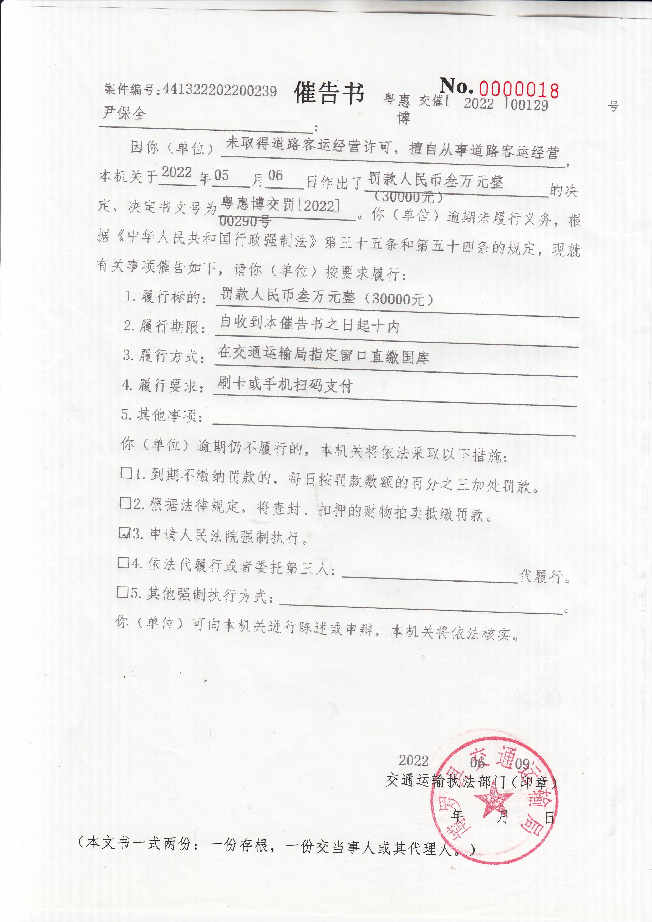 一、蓬江区康东饮品店尹保全使用粤J5656V小型轿车未取得道路客运经营许可,擅自从事道路客运经营案,本机关于2022年05月06日作出了罚款人民币叁万元整(30000元)的决定,决定书文号为:惠博交罚[2022]00290号),但你在本机关决定的期限内不履行义务。