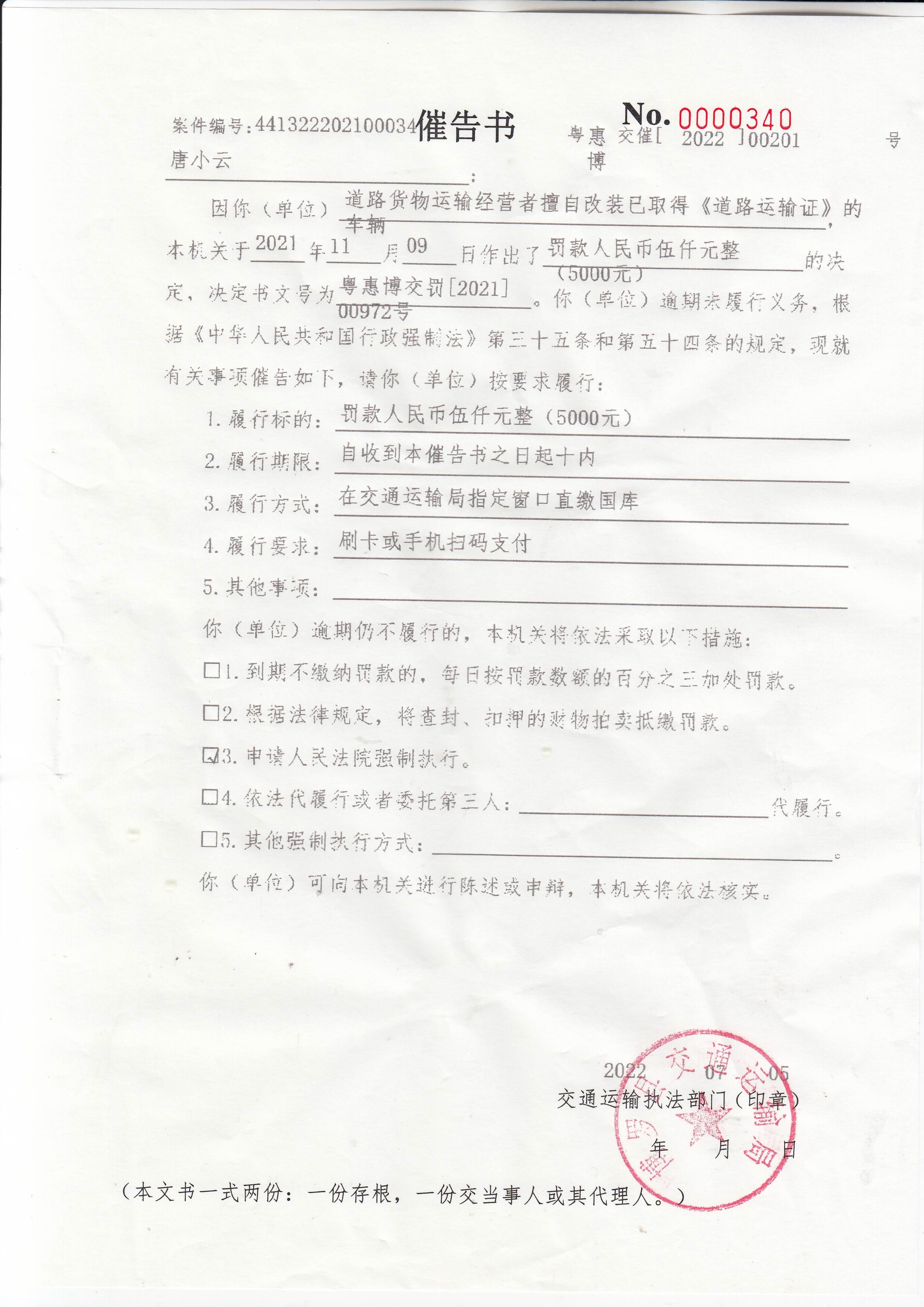 一、唐小云擅自改装湘M5670挂重型货车已取得《道路运输证》的车辆案本机关于2021年11月09日作出了罚款人民币伍仟元整(5000元)的决定,决定书文号为:惠博交罚[2021]00972号),但你在本机关决定的期限内不履行义务。