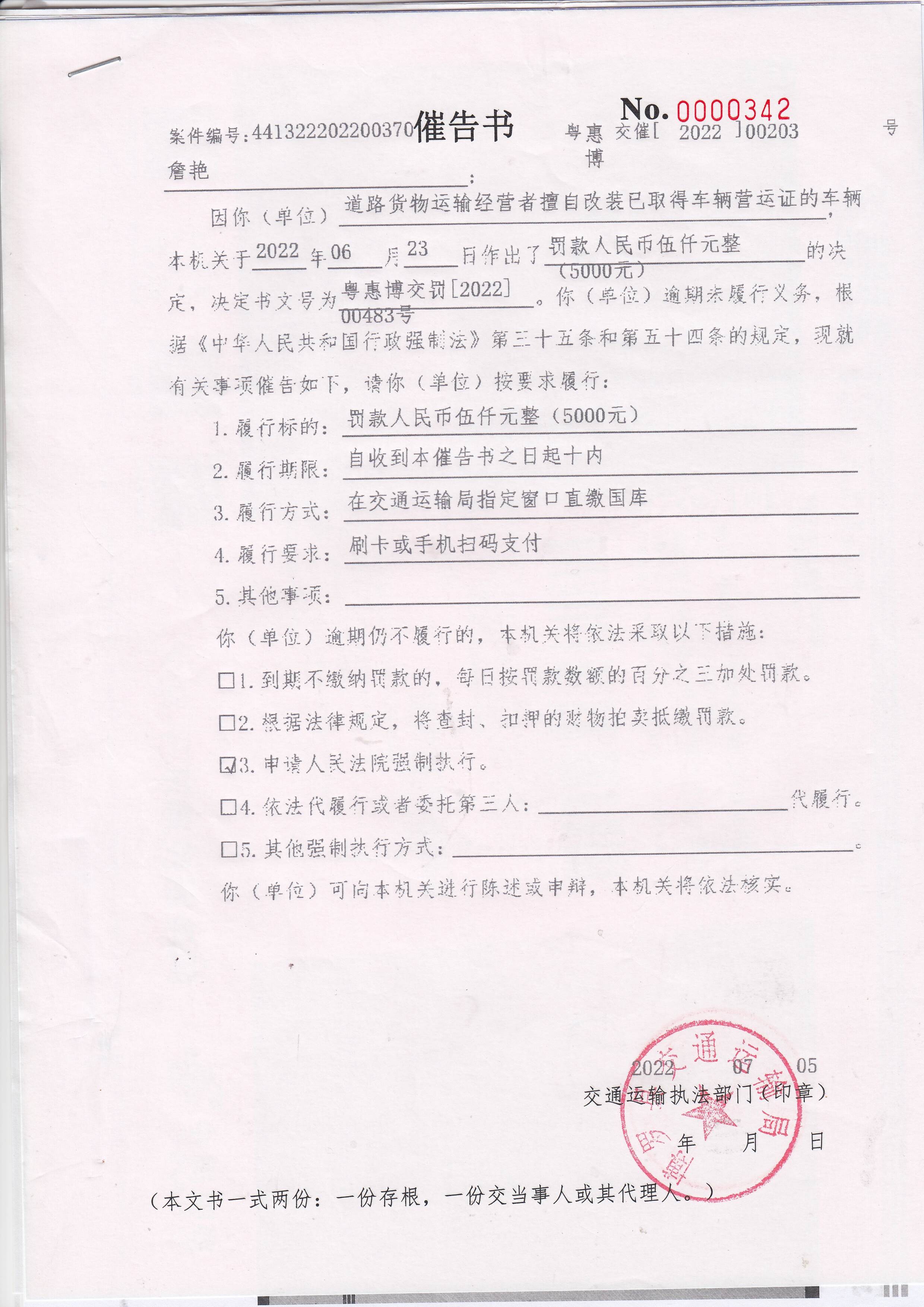 一、你擅自改装湘M5622挂重型自卸半挂车已取得《道路运输证》的车辆案本机关于2022年06月23日作出了罚款人民币伍仟元整(5000元)的决定,决定书文号为:惠博交罚[2022]00483号,但你在本机关决定的期限内不履行义务。